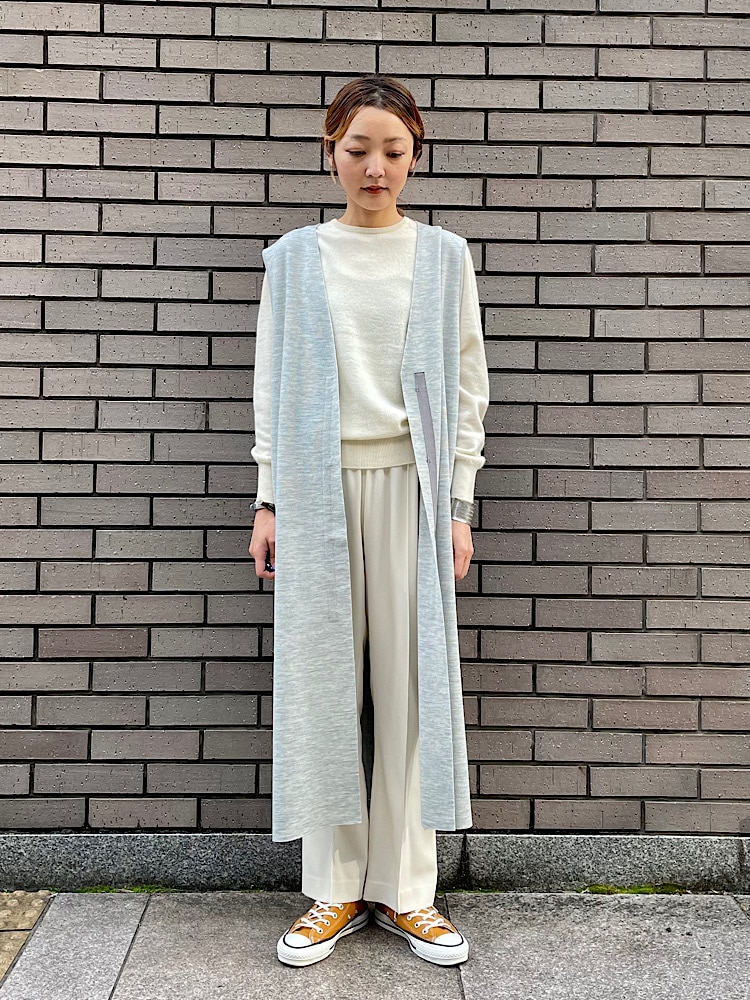 素材感・着心地:薄手のウール素材。中央にフックが付いている為、インナーによって開けたり閉めたりと着回しが可能です。サイドのスリットもポイントです