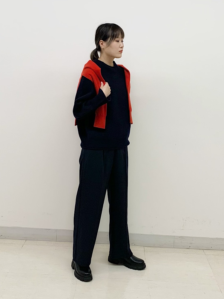 サイズ感:身幅余裕あるが、広がりすぎないシルエット。首元にゆとりがあり、布が直接当たりづらいのでチクチクしづらい。