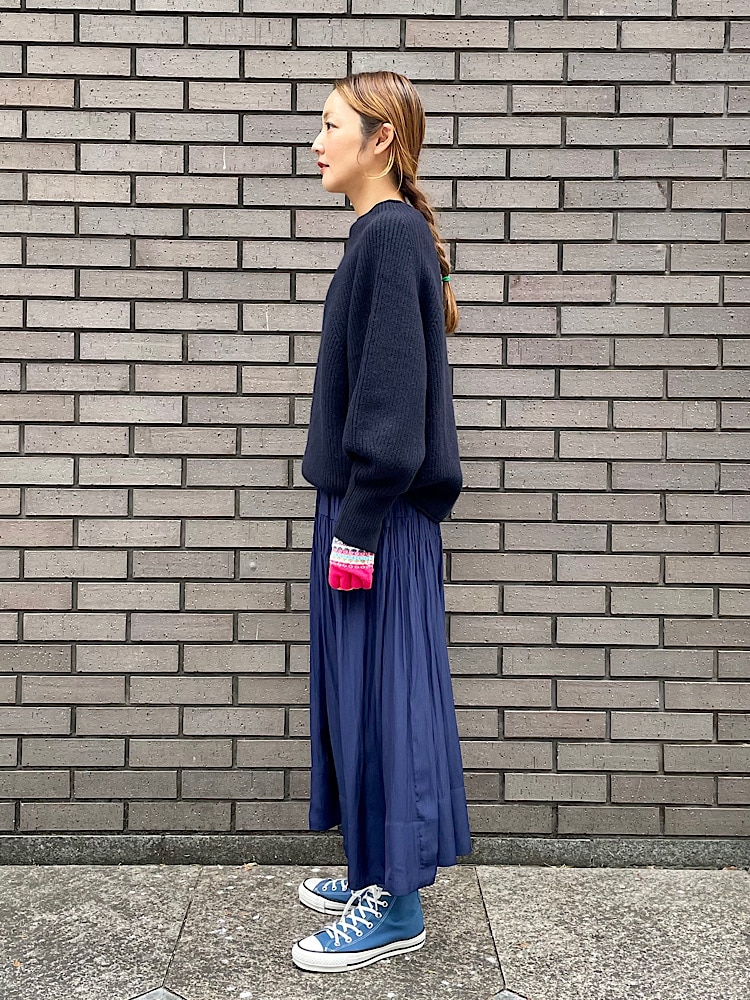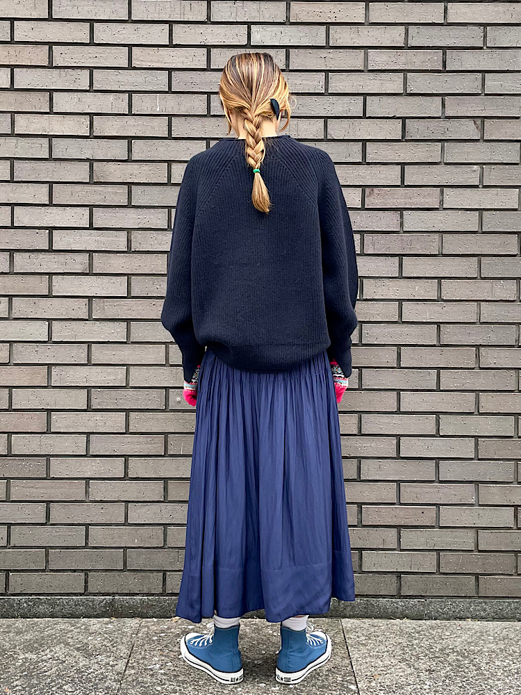 素材感・着心地:ウール/カシミヤの柔らかく厚みのある素材感。袖にボリュームがあり、裾にかけて少し細くなるコクーン型のシルエットです。ボリュームのあるボトムとの相性が抜群です