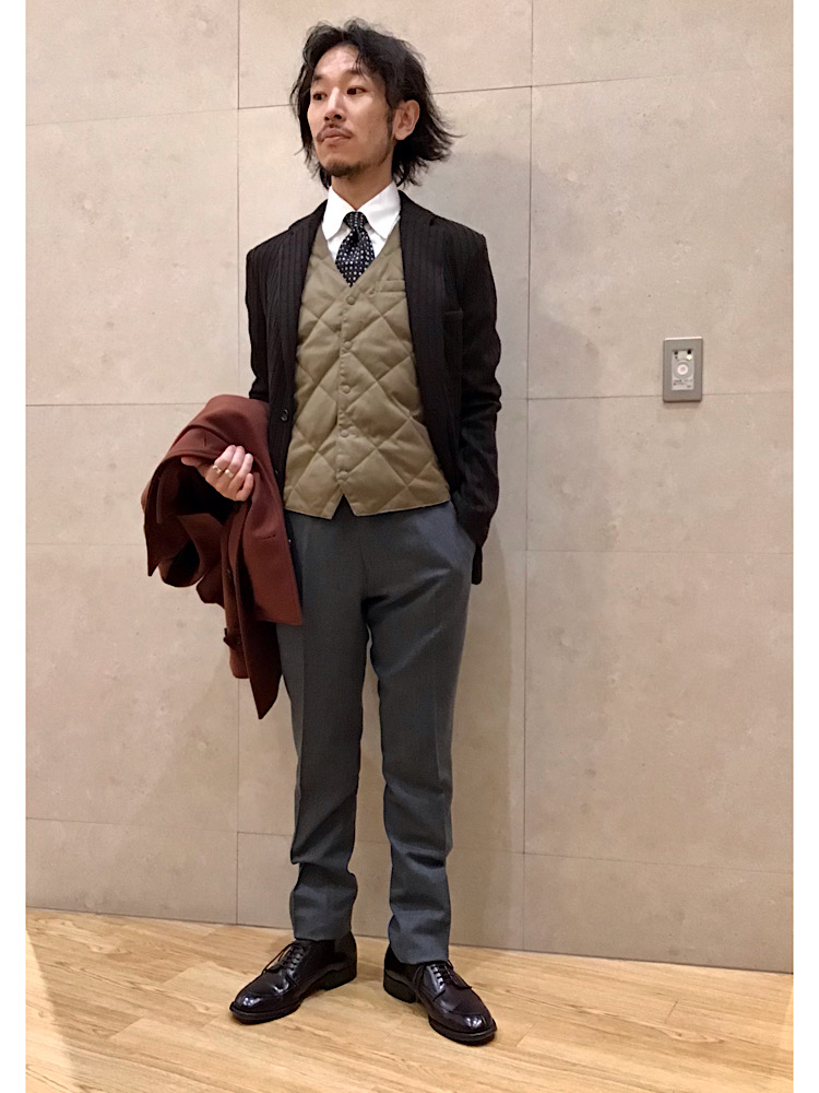 暖かみのある色味を基調にしたビジカジ仕様のコートスタイリング。