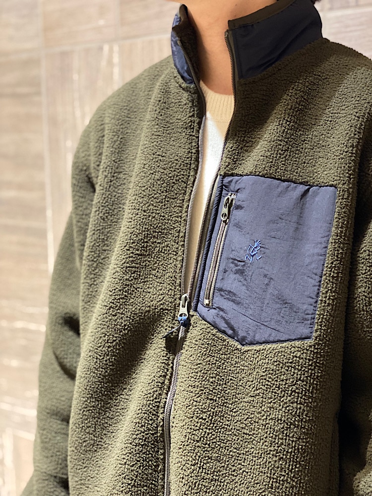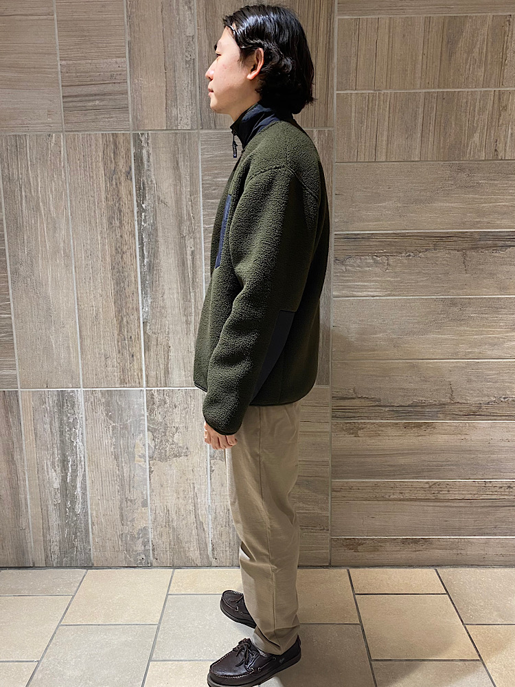 【素材感・着心地】シンプルなデザインのフリースです。今回着たオリーブのカラーは、落ち着き感があるので、カジュアルになりやすいフリースですが綺麗目にも着れると思います。
