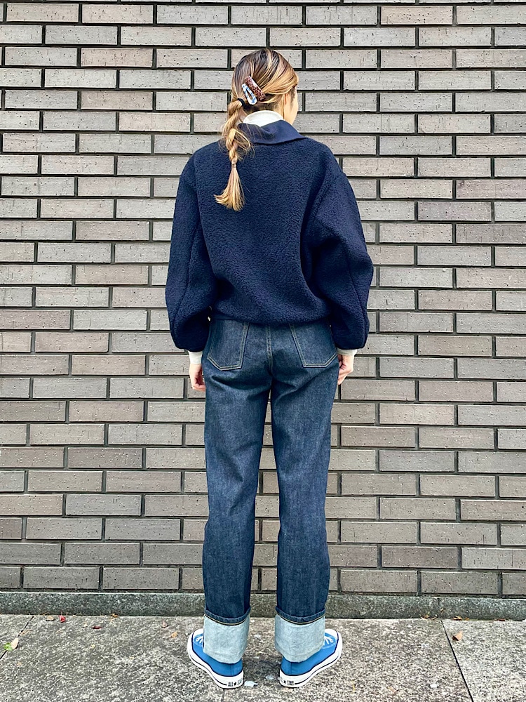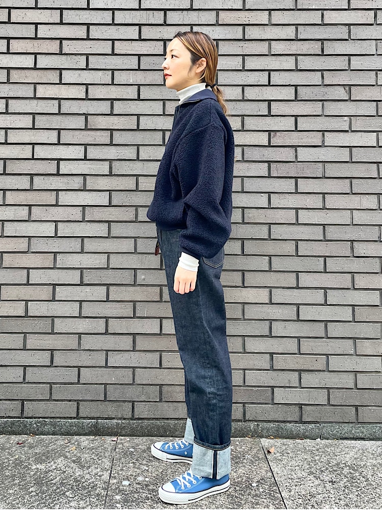 素材感・着心地:アクリル/ポリエステルの起毛感がありボアの様な素材感。着丈は短めですが、肩回りや袖幅はゆったりとしています。ハーフジップになっておりレイヤードスタイルもオススメです
