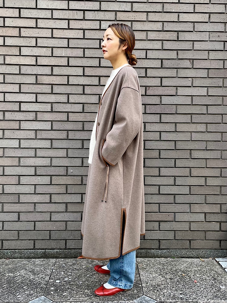 素材感・着心地:ポリエステル/レーヨンにアクリル混です。少し起毛感があり裏地等は付いていない為、軽く羽織って頂けます。身幅や袖幅にはゆとりがある為、インナー次第で長い期間着用できます