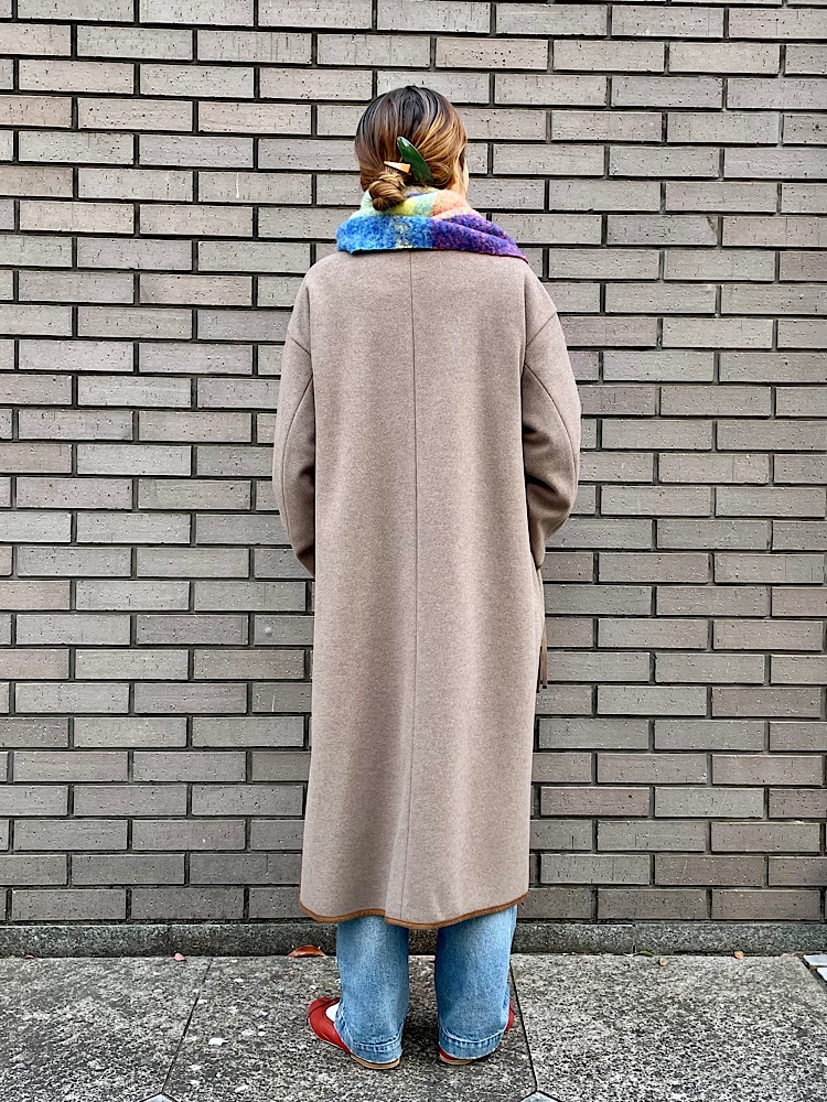 素材感・着心地:フォックス/ナイロンの軽く暖かい素材。腰周りが隠れる程よい丈感です。サイドにスリットも入っておりボトムを選ばず着用できます