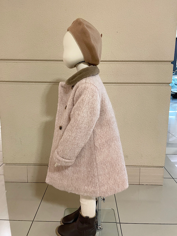女の子らしい優しい色のコートが入荷しております。 襟が取り外せて、シーンに合わせて使い分けることができます。