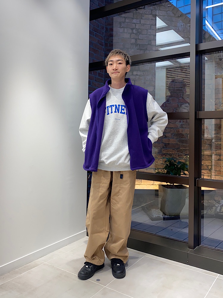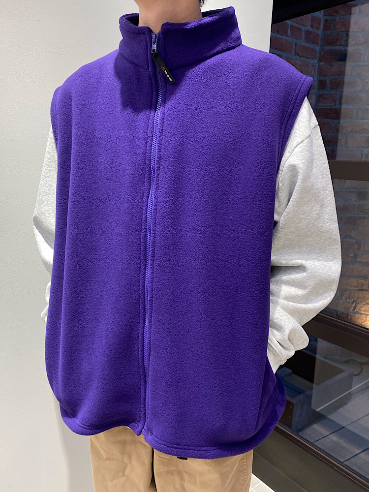 発色のいい紫ベストをシンプルなコーデに合わせた、ベストが主役で雰囲気あるスタイリングです。