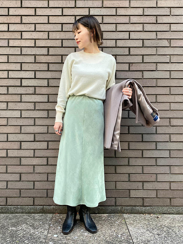 全体的に柔らかいお色味でまとめたフェミニンコーデ