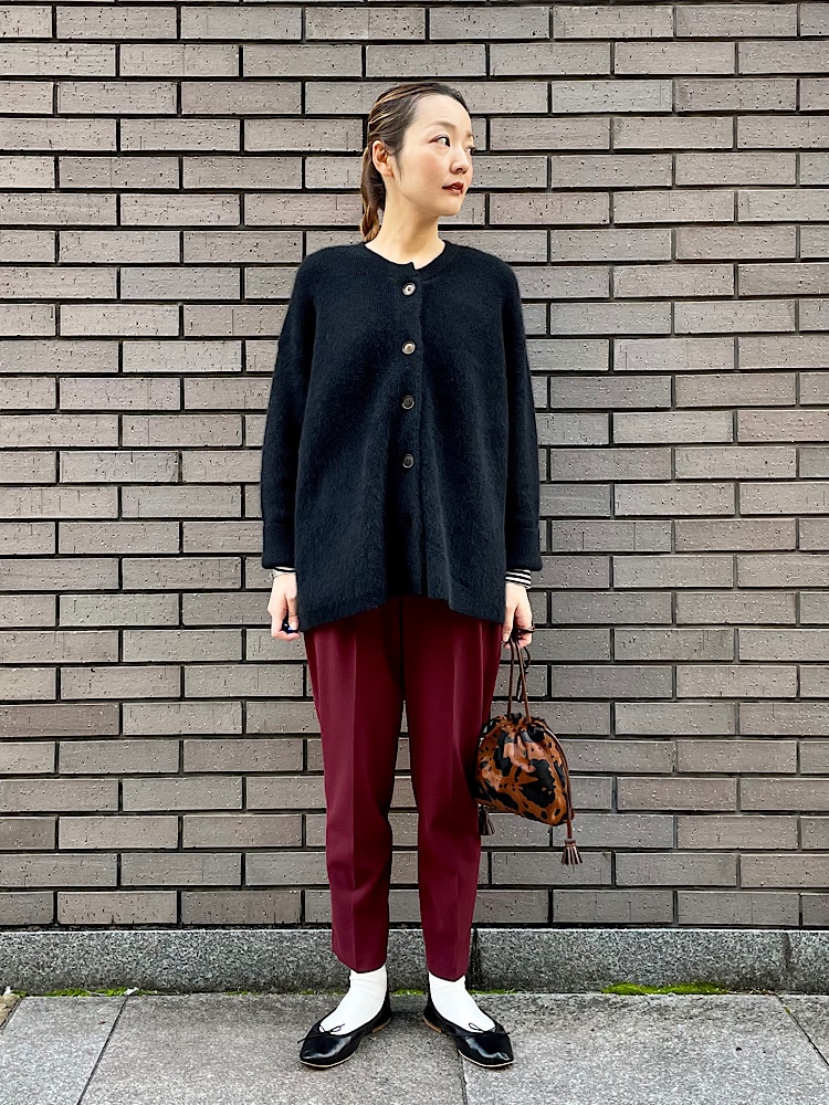 素材感・着心地:ポリエステルのさらりとした素材感。腰周りはタックが入っており裾にかけて細くなるテーパードのシルエットです。トップスを選ばず着用できます