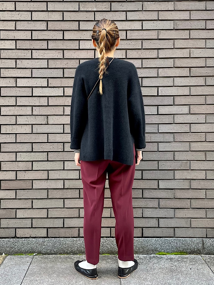 素材感・着心地:ナイロン/ウールの柔らかく軽い素材感。全体的にゆったりとしたシルエットなので羽織りとして着用したり、プルオーバーとして着用したりと着回しが可能です