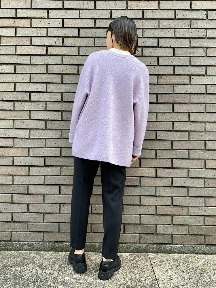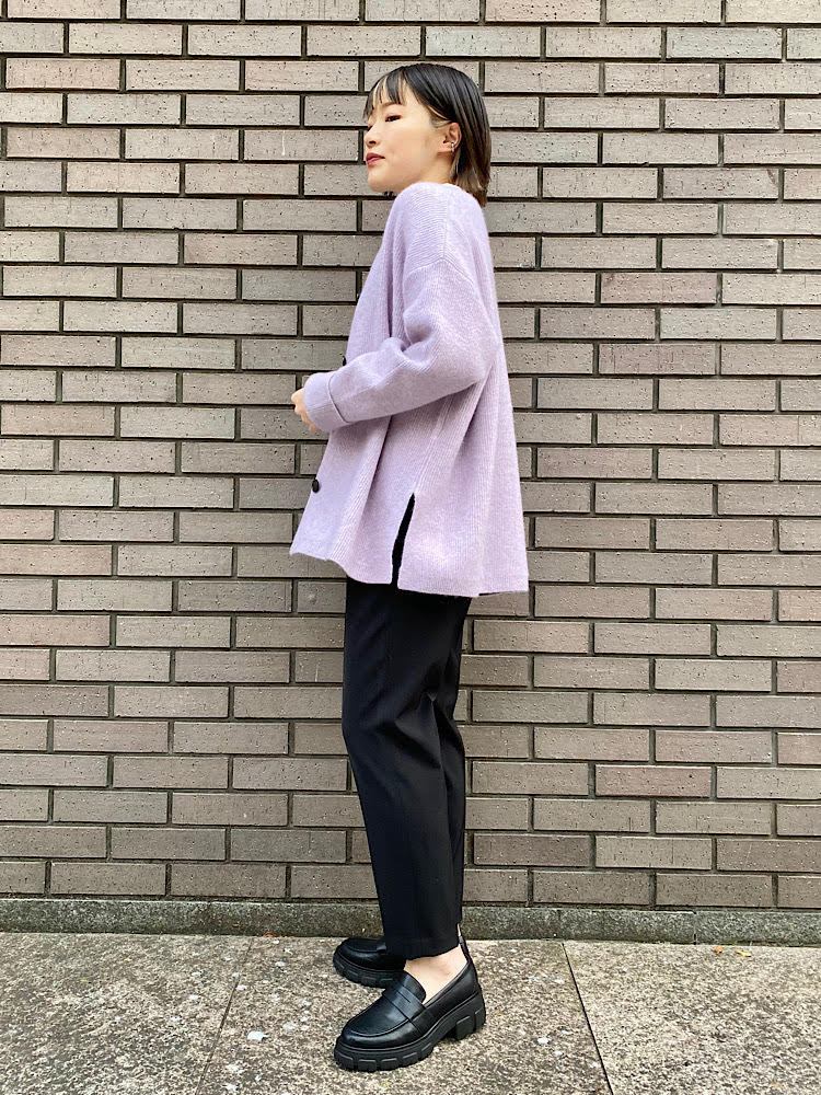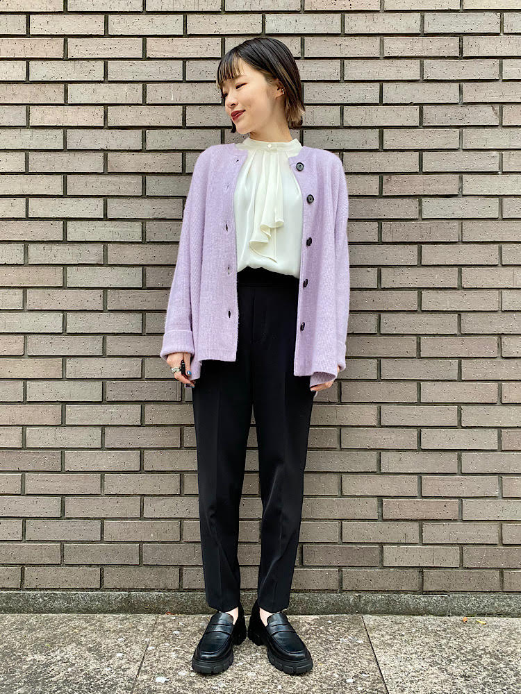 ラベンダー色のカーディガンを差し色にした、