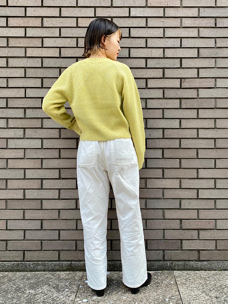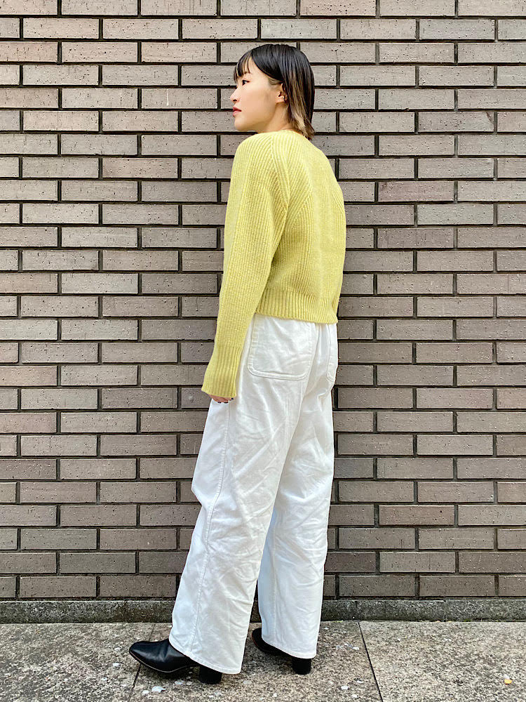 黄色の短丈ニットを主役にしたカジュアルコーディネート