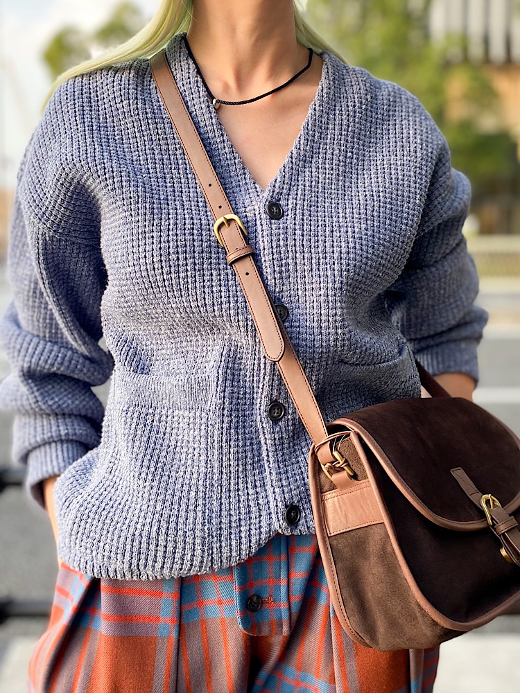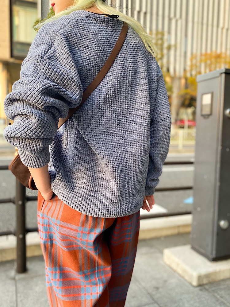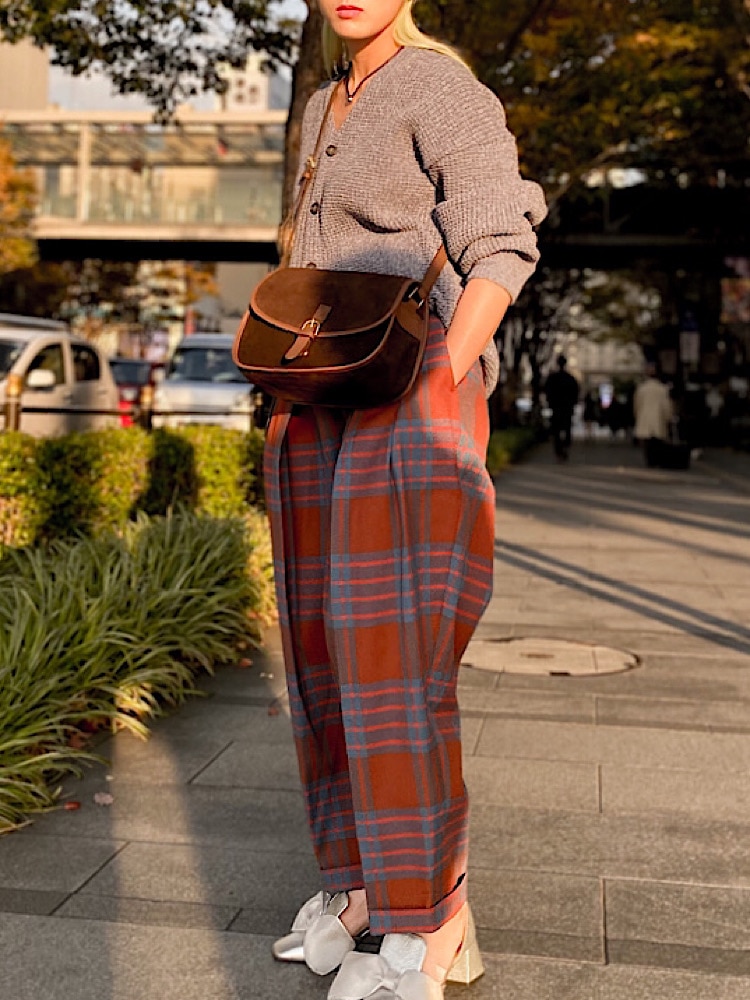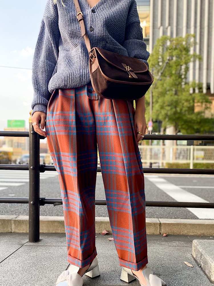 着こなしポイント: トップスを女性らしく着こなしているので、あえてパンツは1サイズあげてゆるく着用するのがポイントです