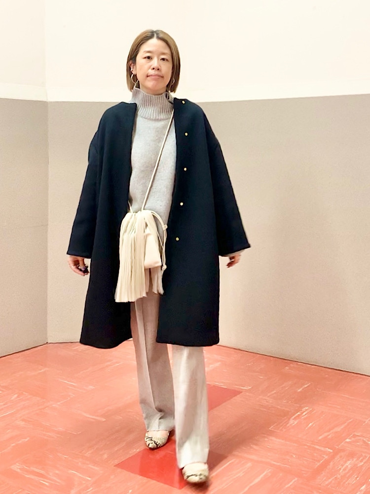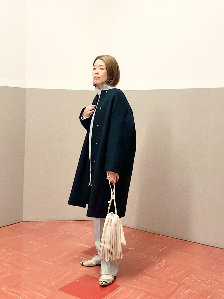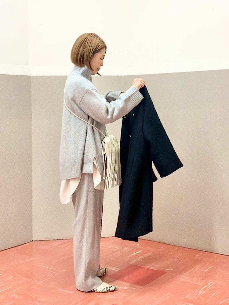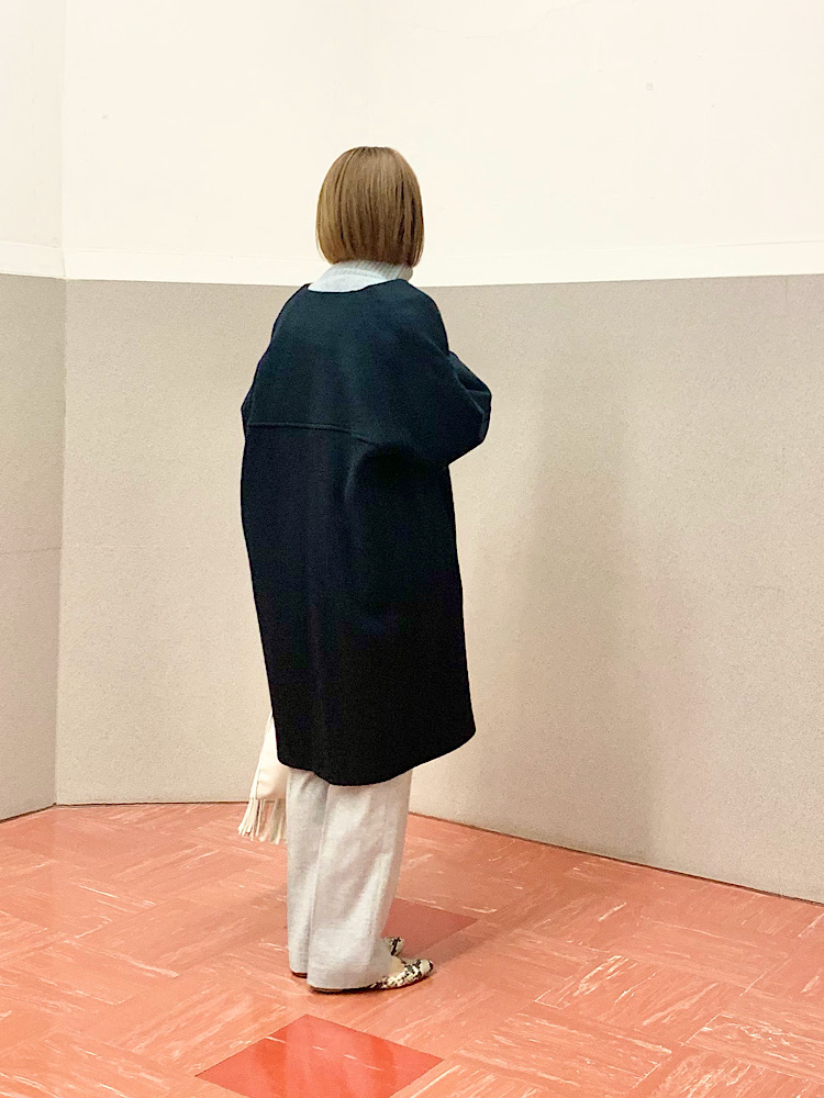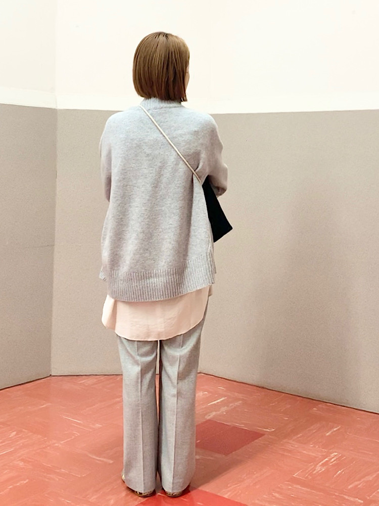 【素材感・着心地】ふっくらと柔らかな素材。中肉程度の厚みでごわつきもなく、コートも羽織りやすい。