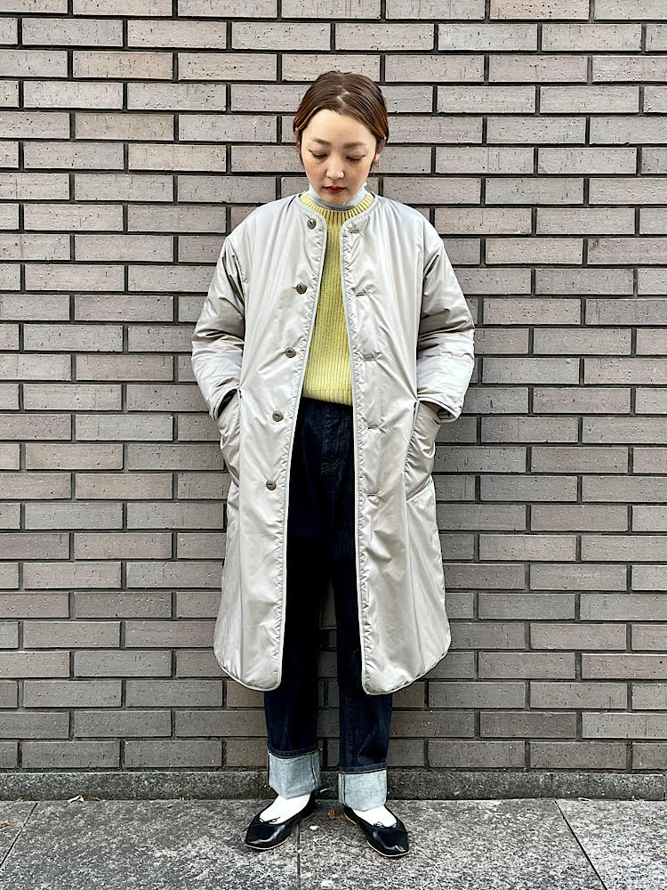 素材感・着心地:厚すぎないウール素材。ラグランの袖付けになっている為、インナーを選びません。ボリュームのあるボトムとの相性が抜群です
