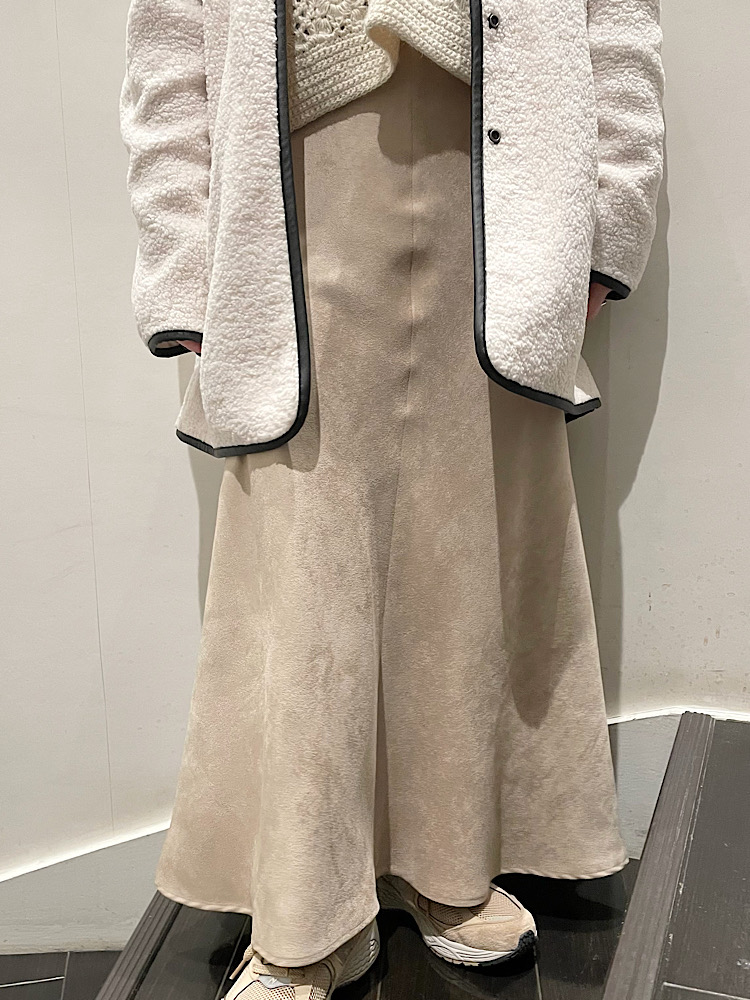 商品紹介:ウエストがゴムなのですが、くしゅっとしていないのでタックインをしたときに切り替えが綺麗に見えるスカートです。少しマーメイドラインなのも裾に動きが出て女性らしいシルエットです。