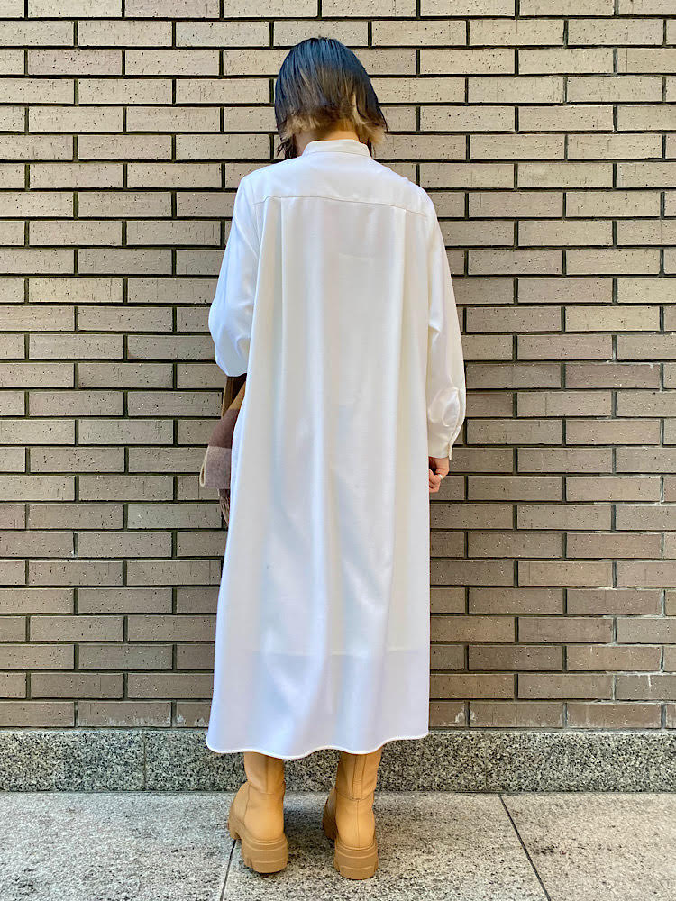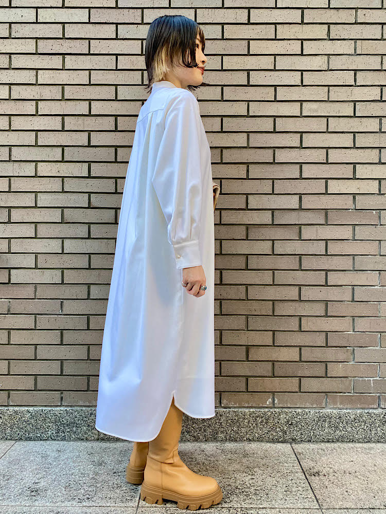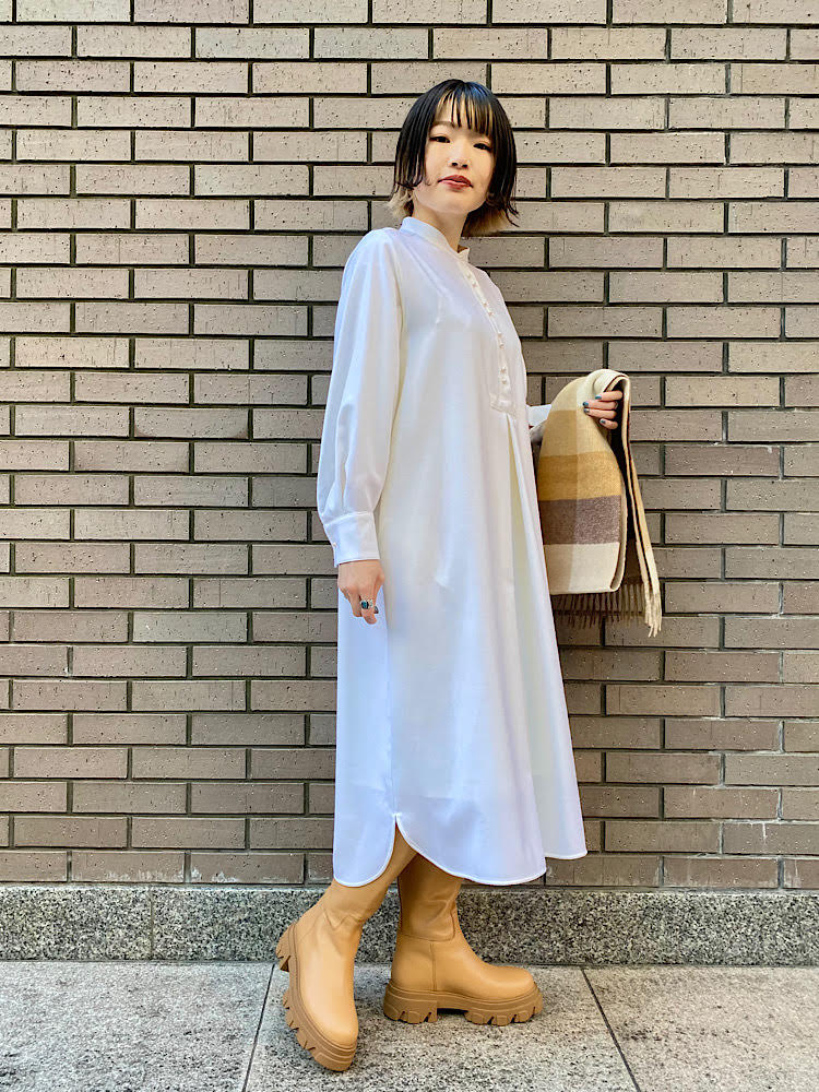膝下くらいの着丈で、ロングブーツとのバランスも◎
