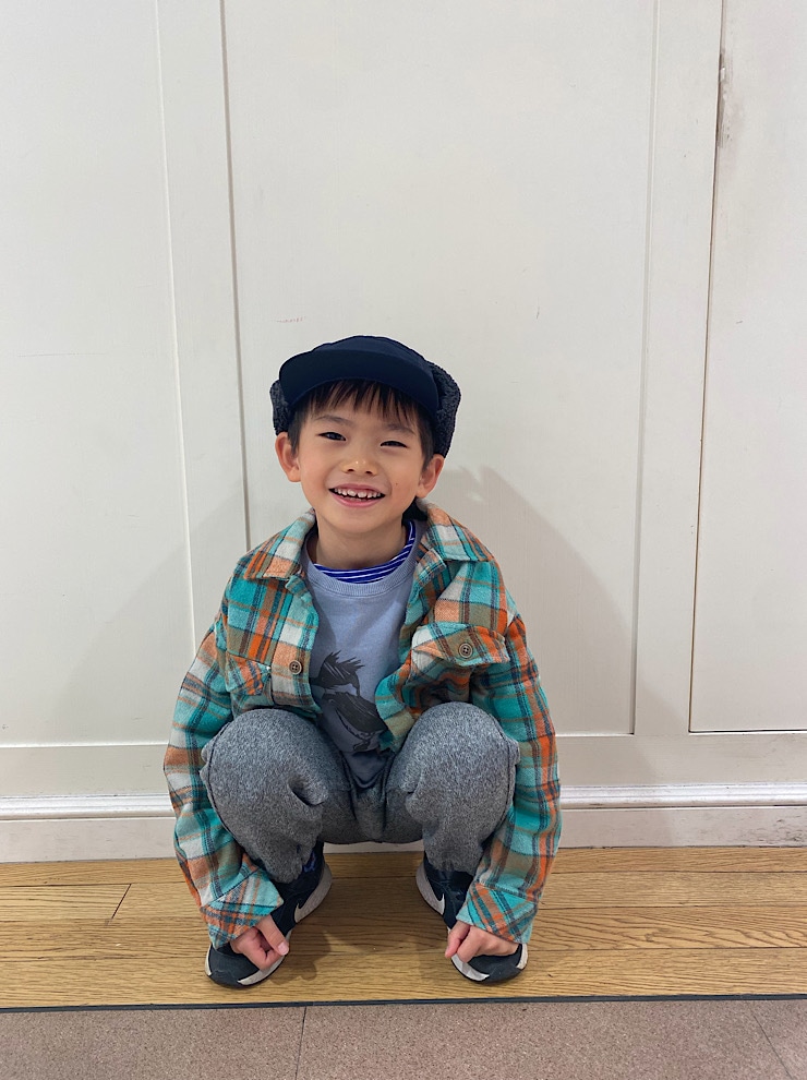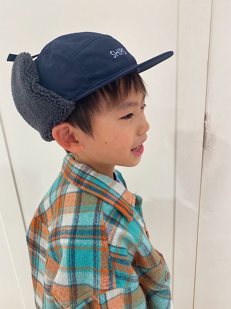 オーバーサイズのシャツジャケットにあったかフリースパンツを合わせたコーディネート。gramicci別注のパンツは細身のシルエットでスッキリ見せてくれます。ボアがかわいいフライトキャップは後ろでサイズ調整でき便利です。身長120cm