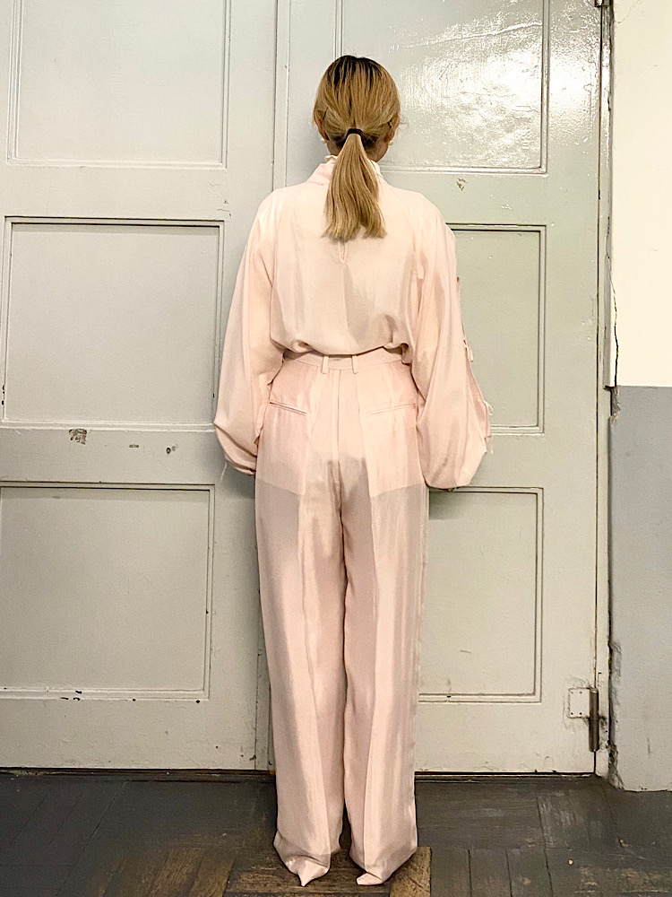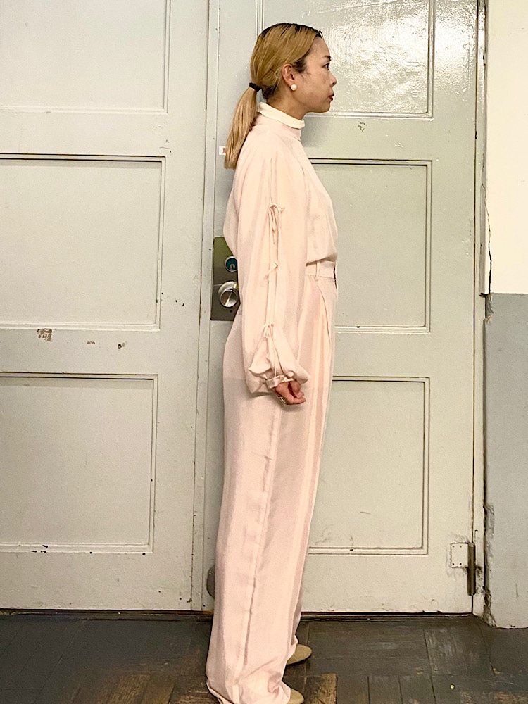 素材感・着心地:ブラウスと同素材のキュプラ100%で透け感があり柔らかな見た目と着心地です。