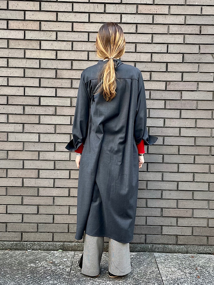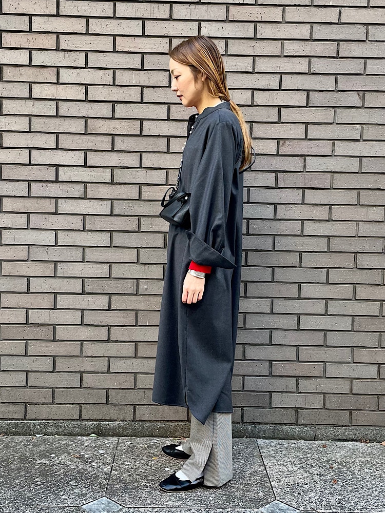 素材感・着心地:厚みのないウール/ポリエステルの素材。パンツを重ねていますが、今年はブーツ合わせもトレンド感が出て可愛いです
