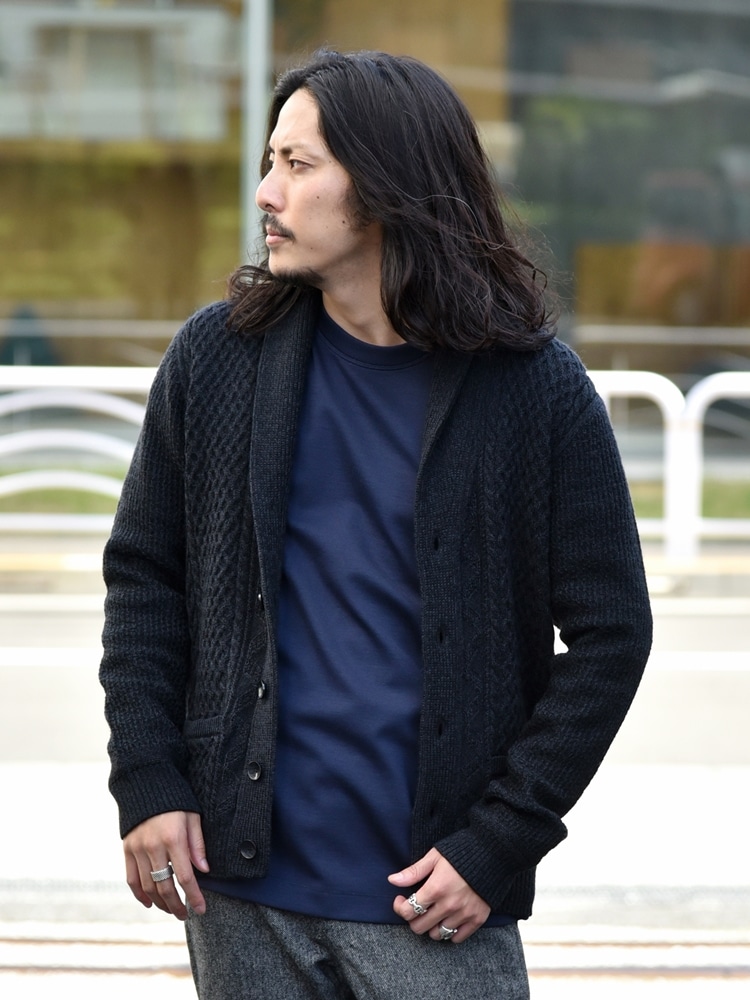 フィッシャーマンパターンのショールカーデにアンゴラ混のウールパンツを合わせた、生地の表情に拘った冬コーデ