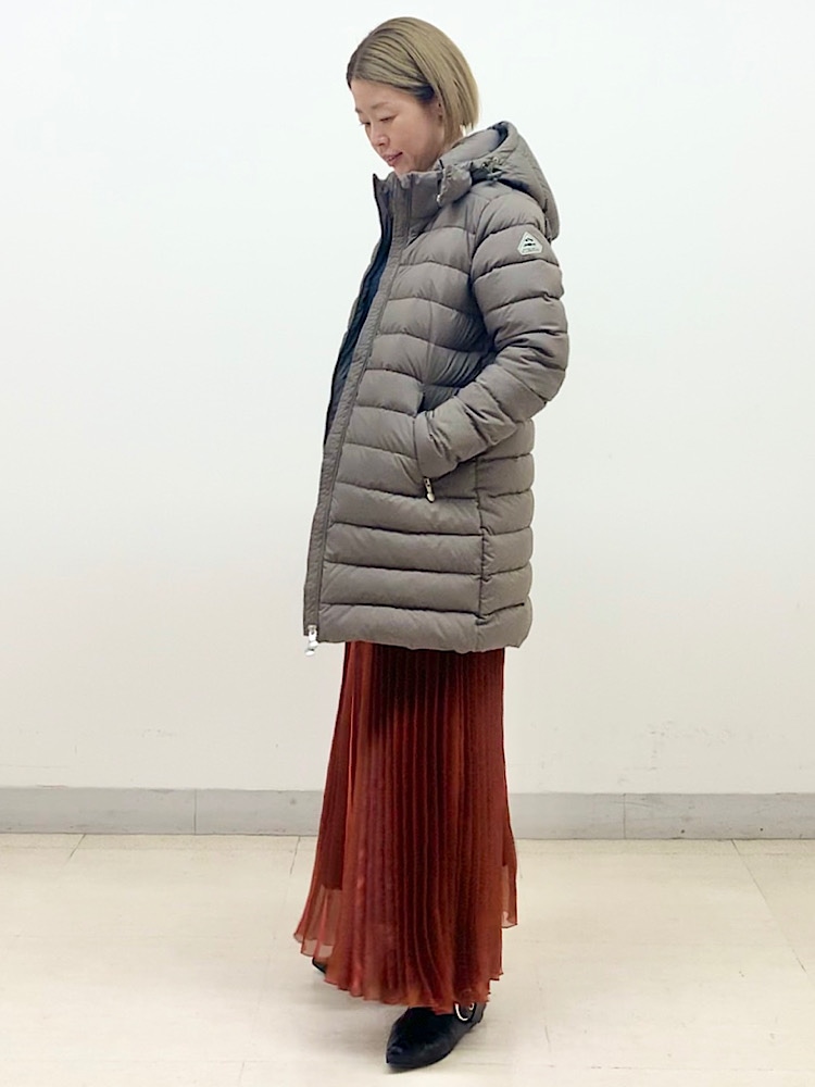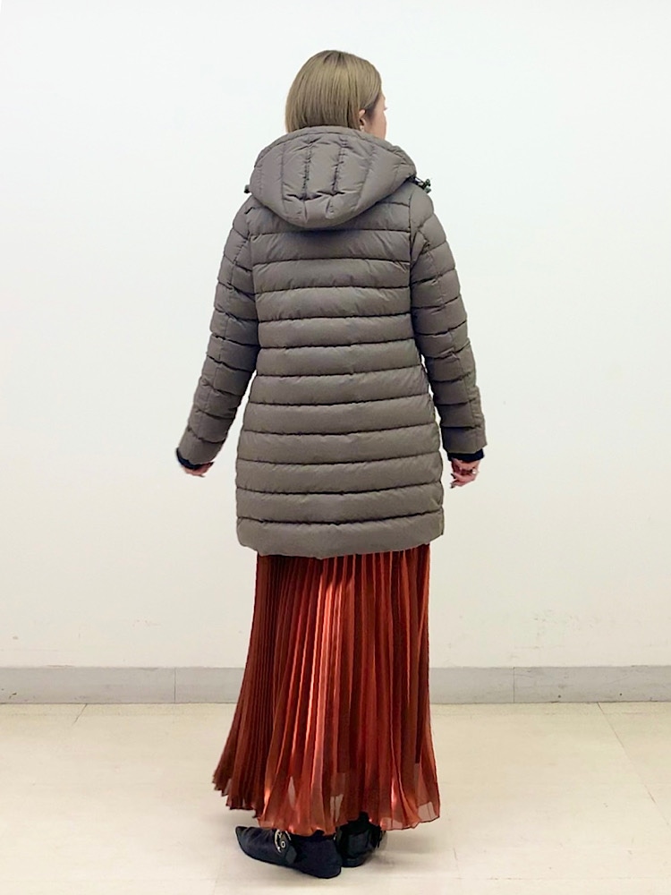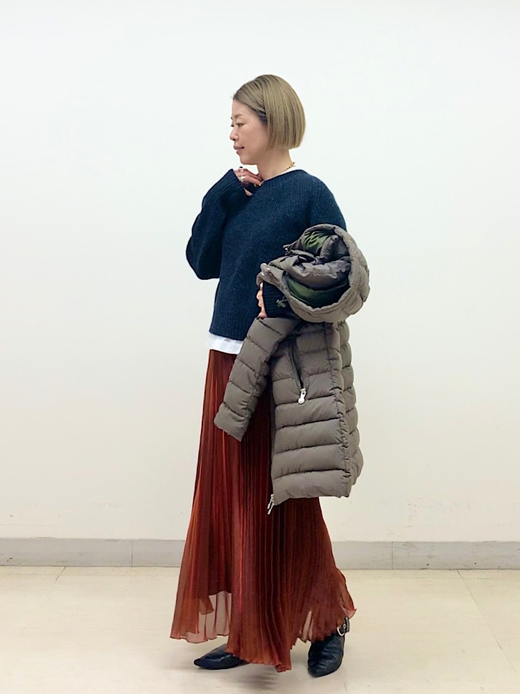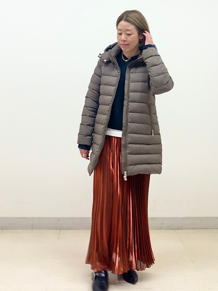 ロングダウンとロングスカートのコーディネート。インナーのニットをコンパクトにすることでバランスアップ。
