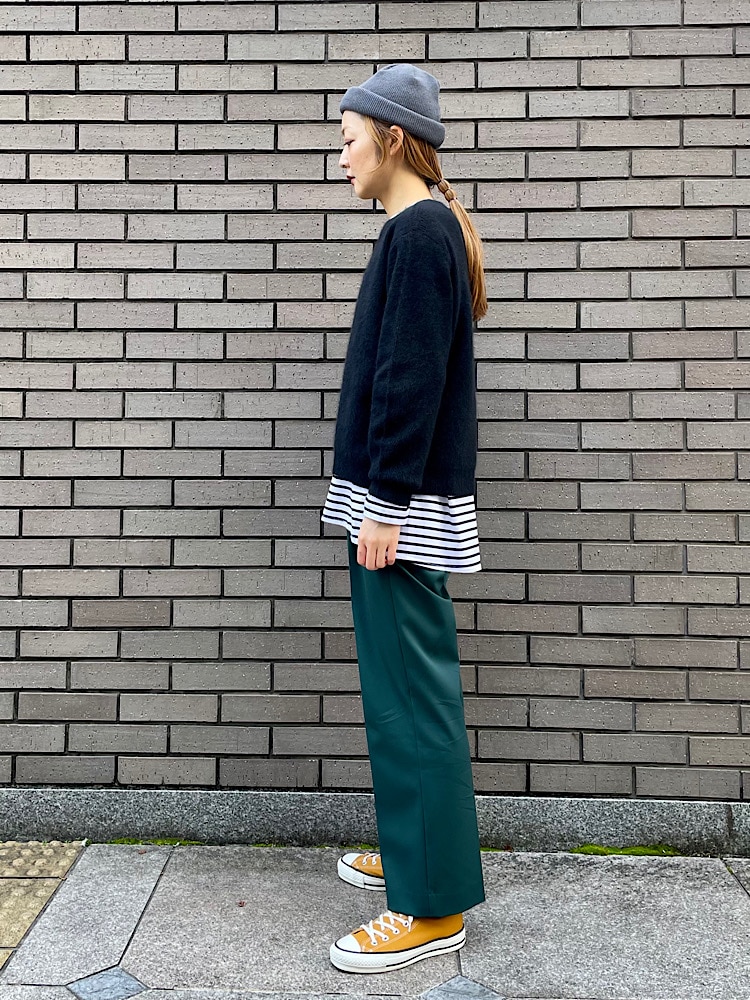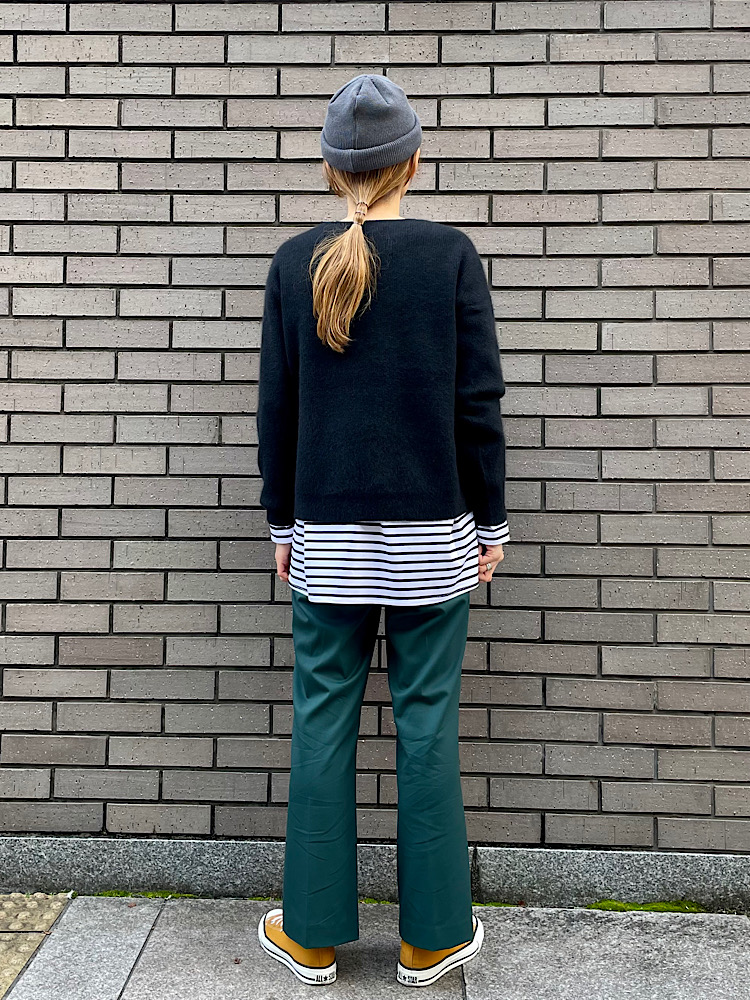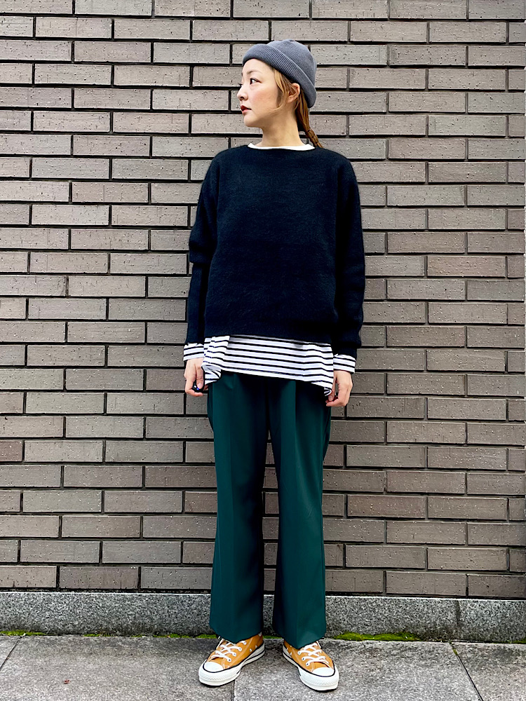 素材感・着心地:ナイロン/ウールの柔らかい素材感。程よくゆとりがあり、厚みもないので着用しやすいです。ボトムを選ばず着用できます