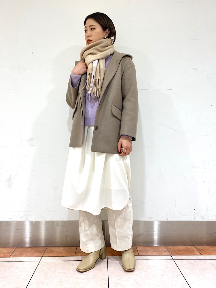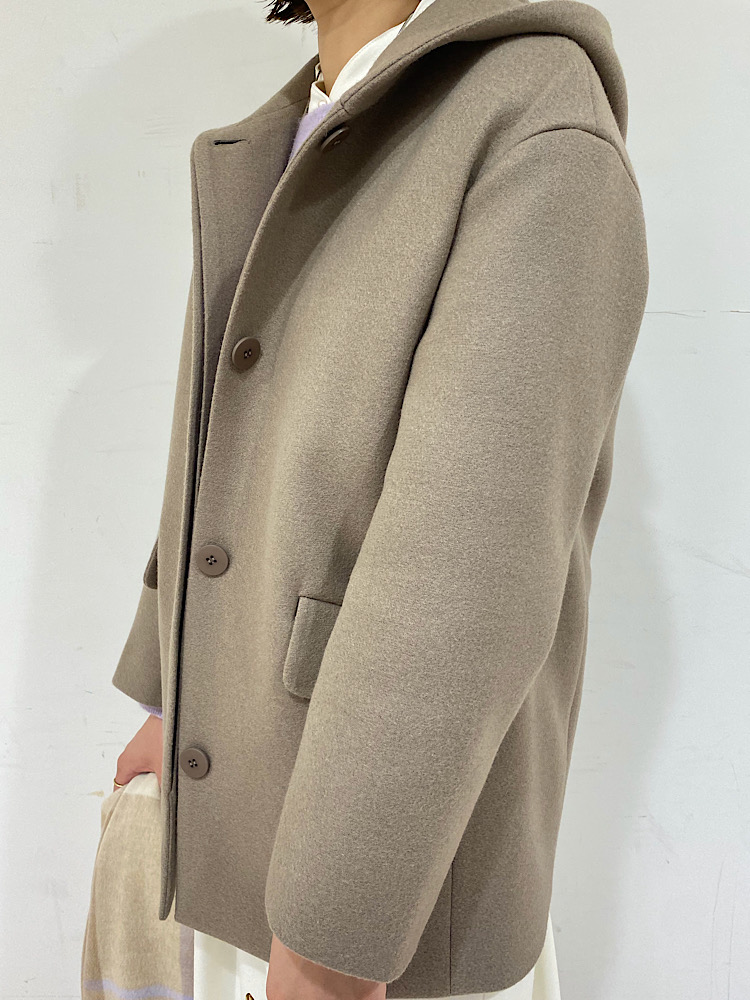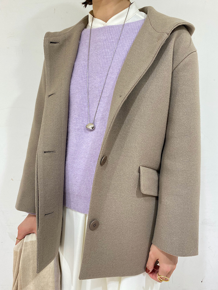すっきり見えするが、ややドロップショルダーになっているため、ニットなどもごわつくことなく着れる。