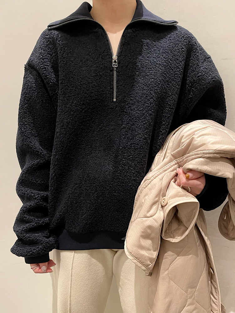 商品紹介:襟元がジップになっているので全部閉めてタートルネックにもできますし、開けると襟っぽくなるので着回しが色々楽しんでいただけます。1枚でも着れるくらい厚めの生地感です。