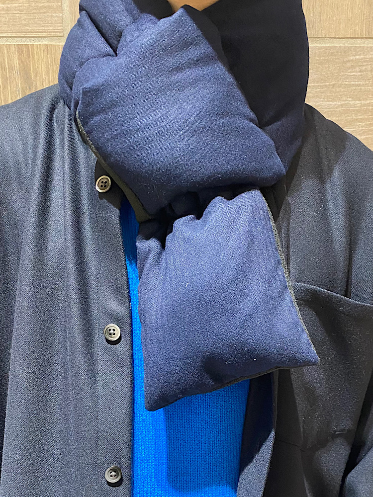 【素材感・着心地】ダウンマフラーで、着脱しやすい作りです。首にしっかりフィットするので、より温かさがあります。
