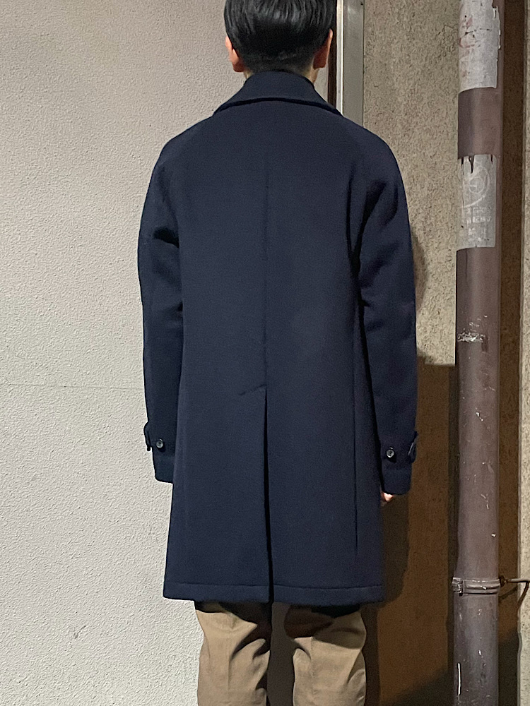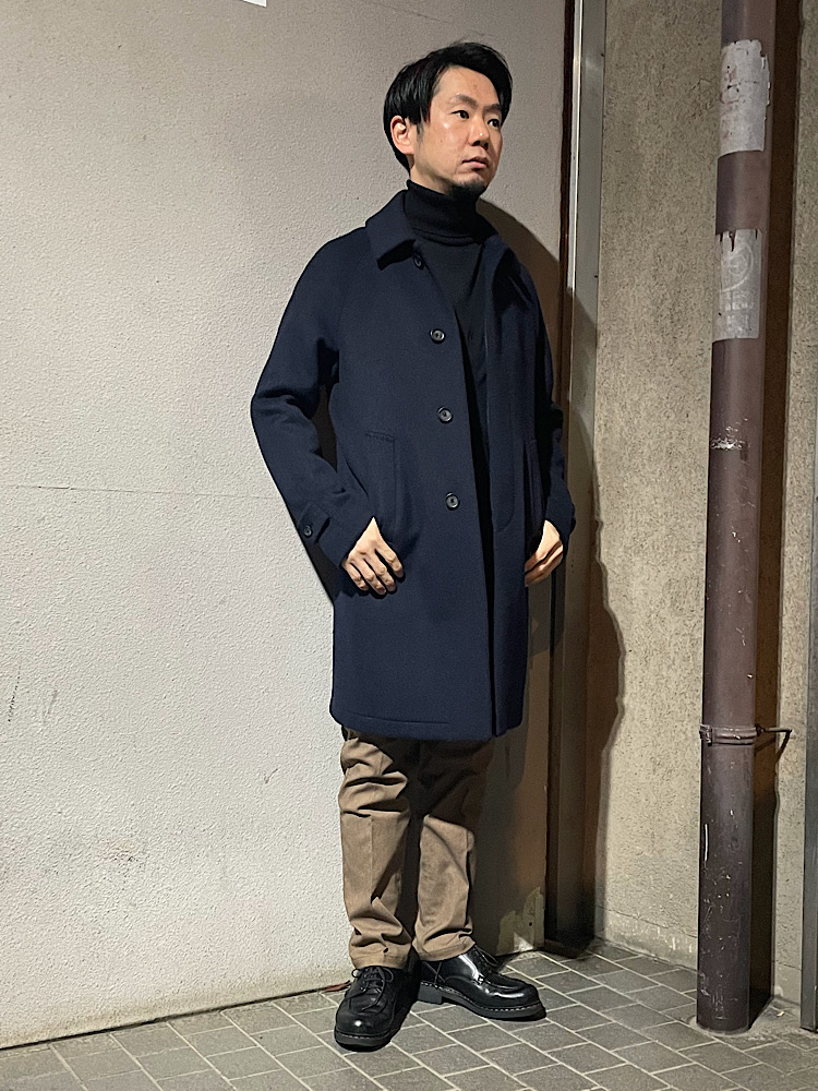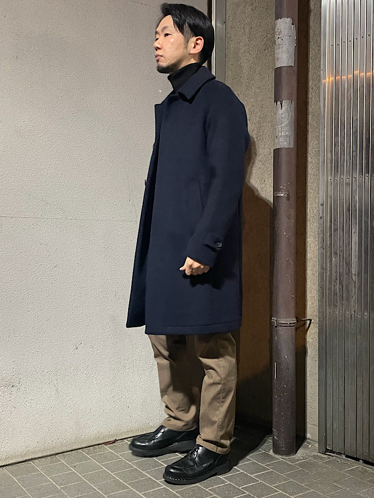 素材感/着心地:少し毛足が長めのウール素材。柔らかくしなやかで着易い。定番のカーコートはオンオフ兼用で着用できます。