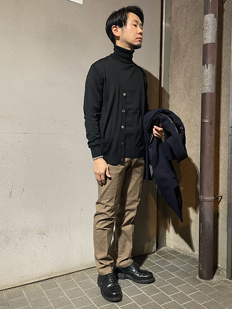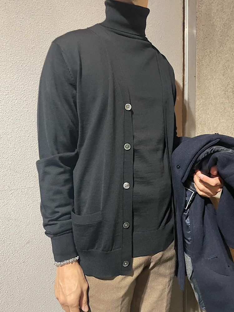 素材感/着心地:ハイゲージのウール素材。ベーシックなカーディガンで色んなコーディネートに取り入れ易い。