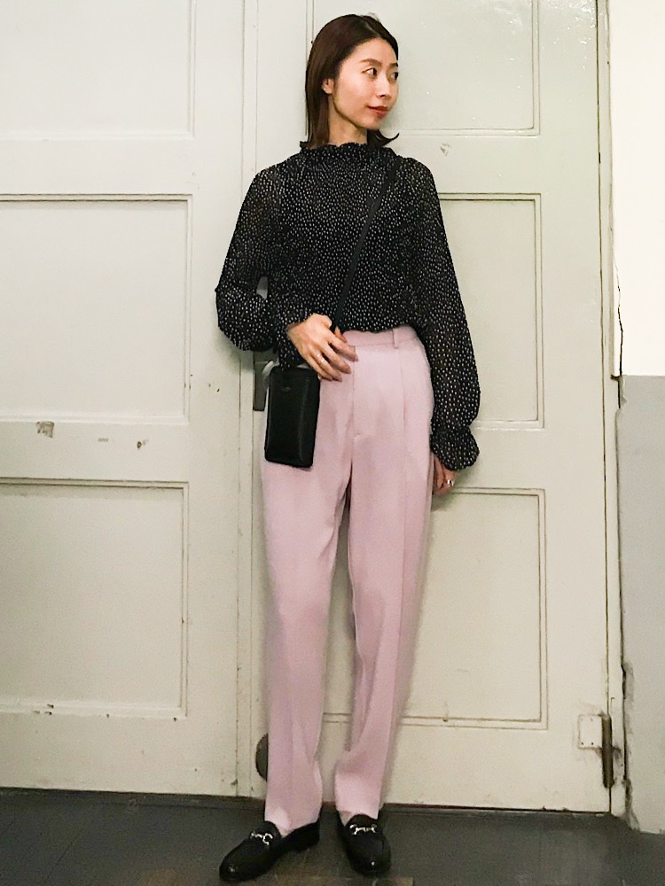 サイズ感:ジャストサイズ。ウエストはスッキリでヒップ周りは余裕がある為スタイル良く見えます。