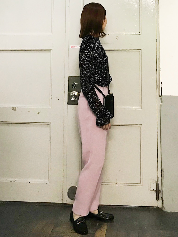 サイズ感:ジャストサイズ。ウエストはスッキリでヒップ周りは余裕がある為スタイル良く見えます。