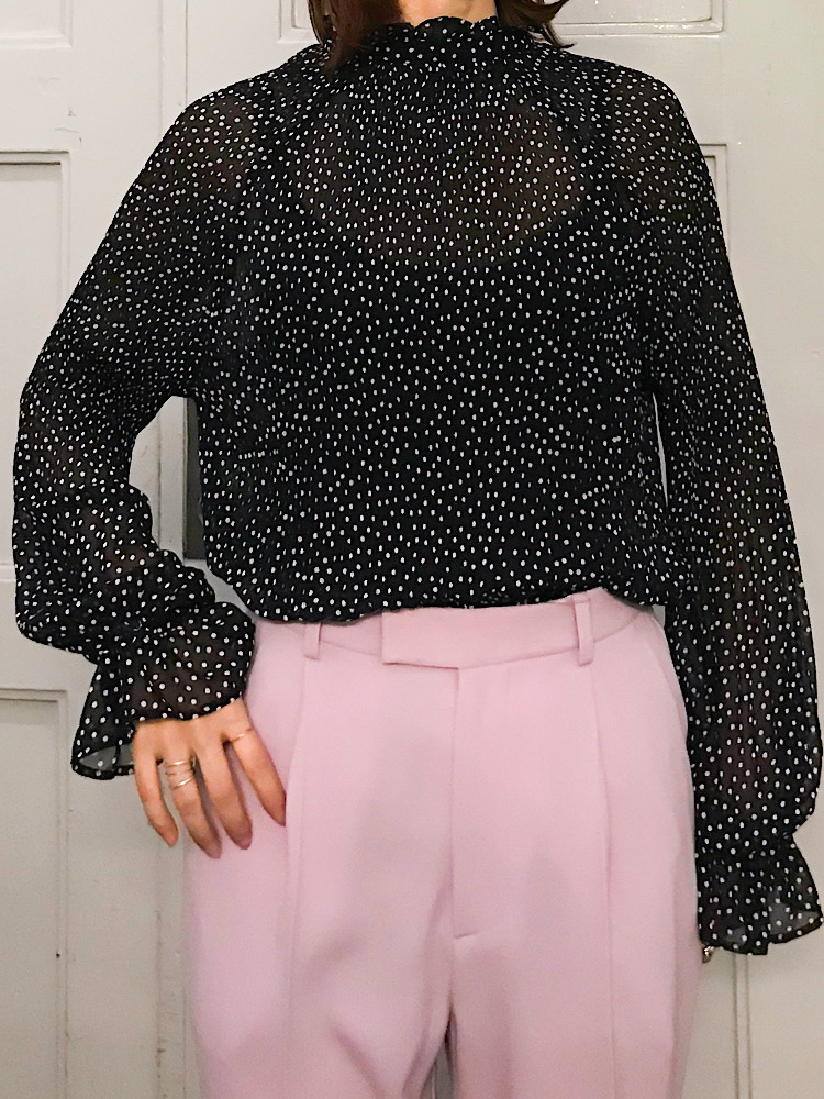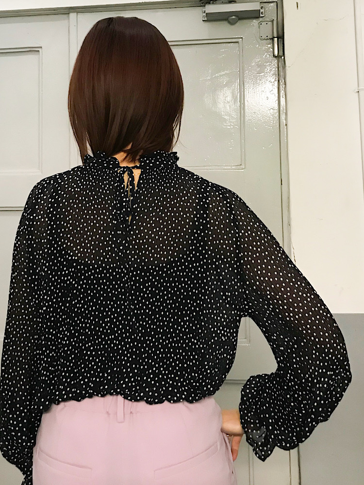 素材感・着心地:ポリエステル100%。細かくプリーツが入ってますが柔らかいので違和感無く着て頂けます。