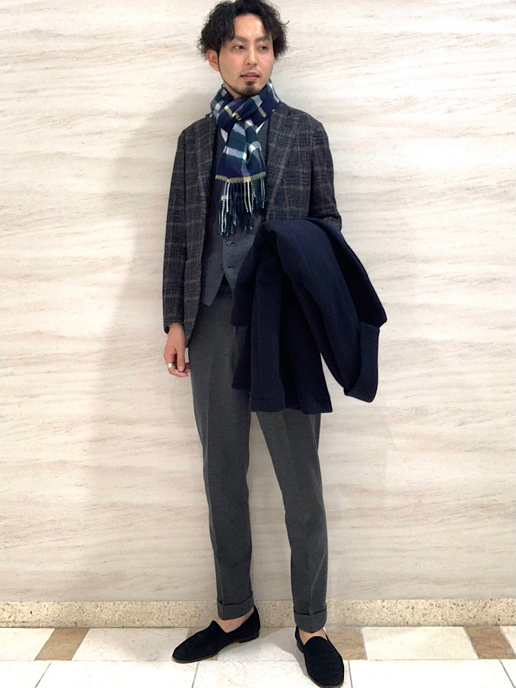 ジャケット上に着てもスッキリ納まるシルエットです