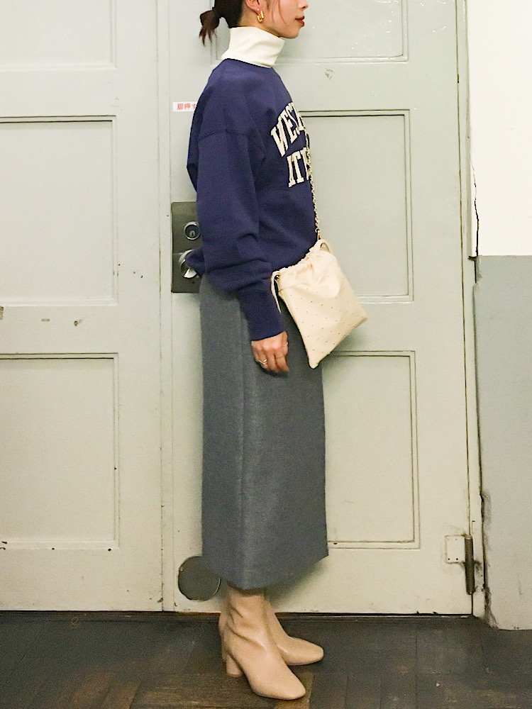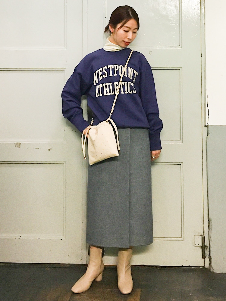 サイズ感:ざっくり緩やか。全体的に余裕があるので重ね着しやすいです。着丈はヒップが半分隠れるくらいです。