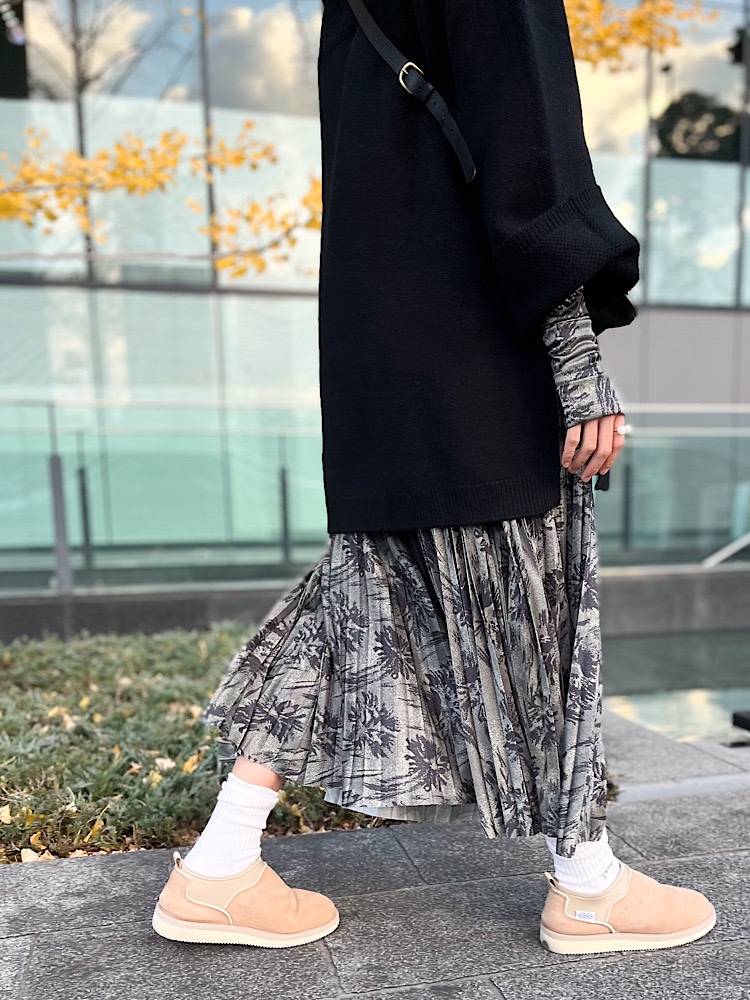 着こなしポイント: フィット感のあるワンピースです。柄が苦手な方でもレイヤードするときやすいです。
