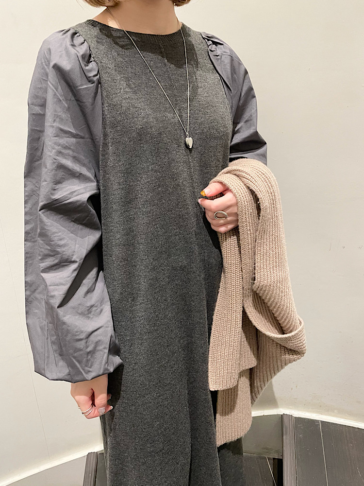 商品紹介:袖の膨らみが肩位置の少し内側から膨らんでいるので肩幅が大きく見えずらく小柄な方でもスッキリとしたシルエットで着用していただけます。