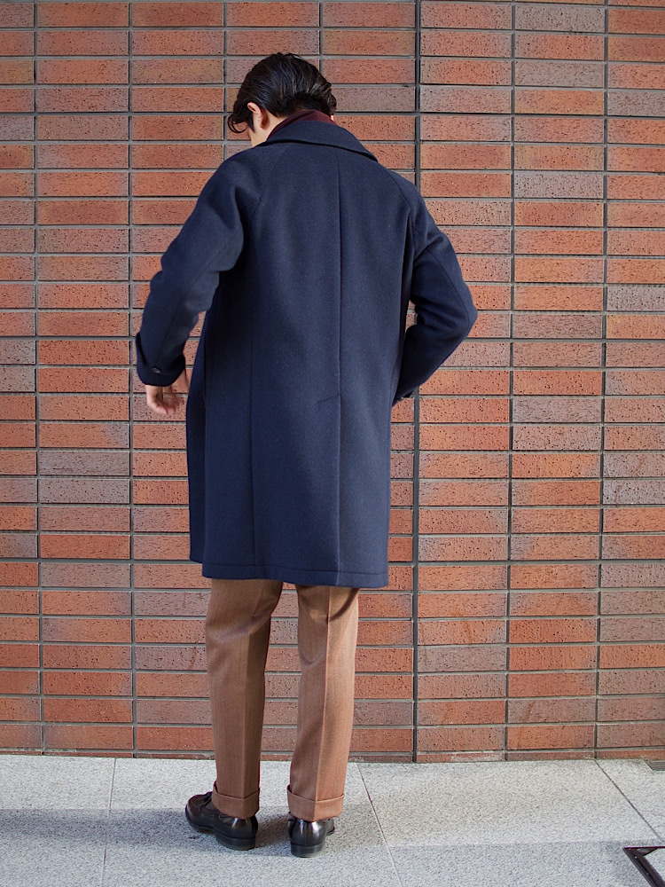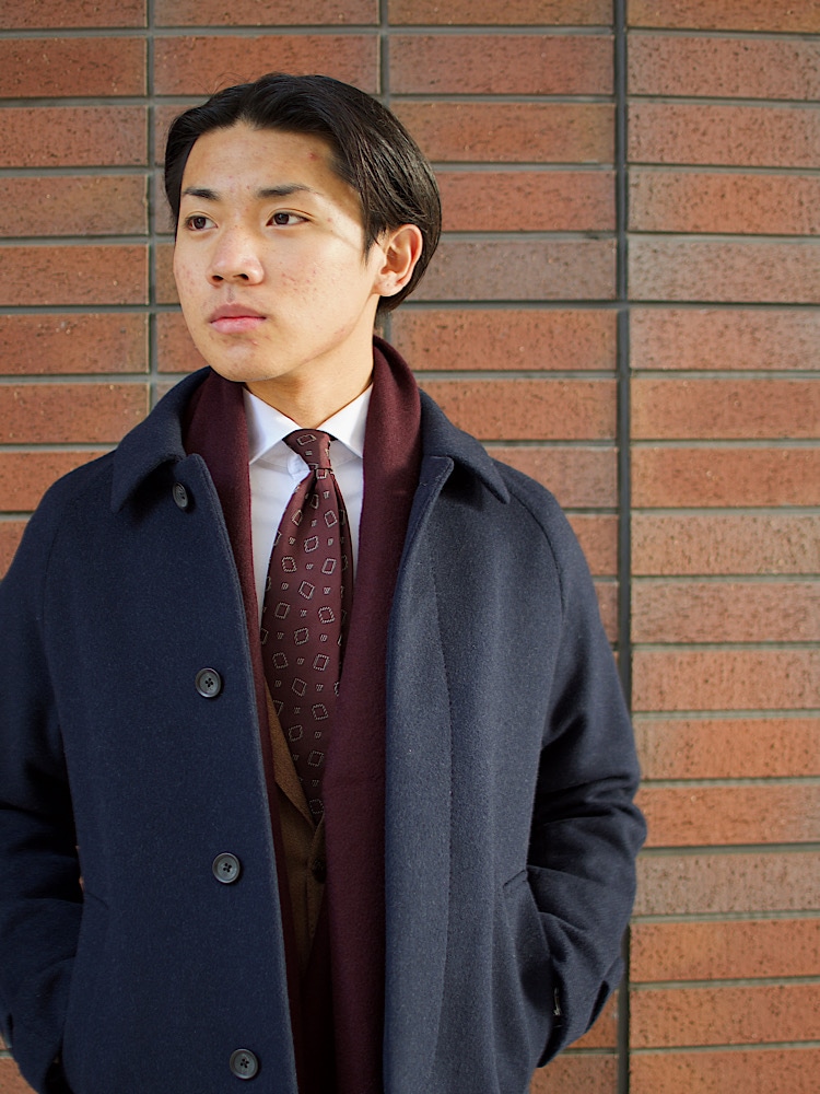 ネイビーコートで全体の色味を落ち着かせクラシックな印象に。