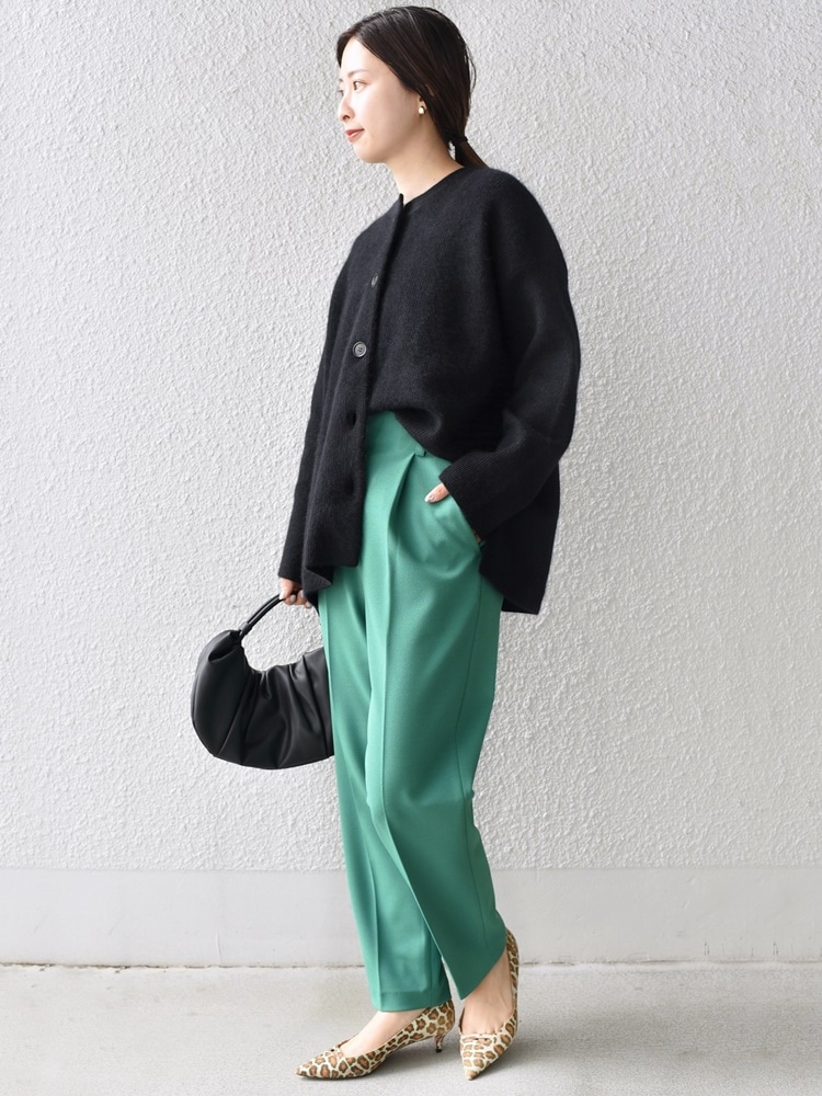鮮やかなグリーンのパンツが映えるコーディネート♪