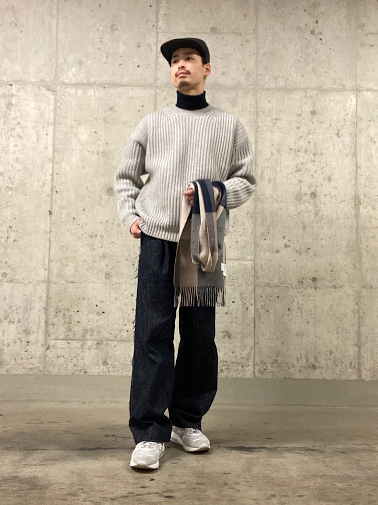 今っぽいサイズ感のニットでシンプルにコーディネートしました。