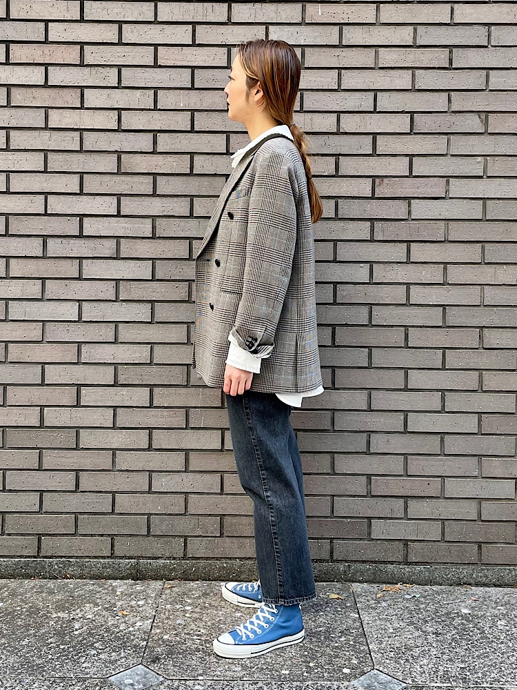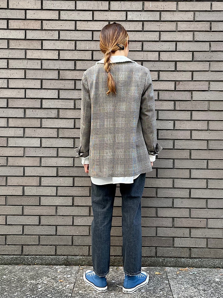 素材感・着心地:ウール素材で袖には裏地も付いています。ダブルボタンの仕様ですが、開けても広がらずスッキリと着用できるシルエットです
