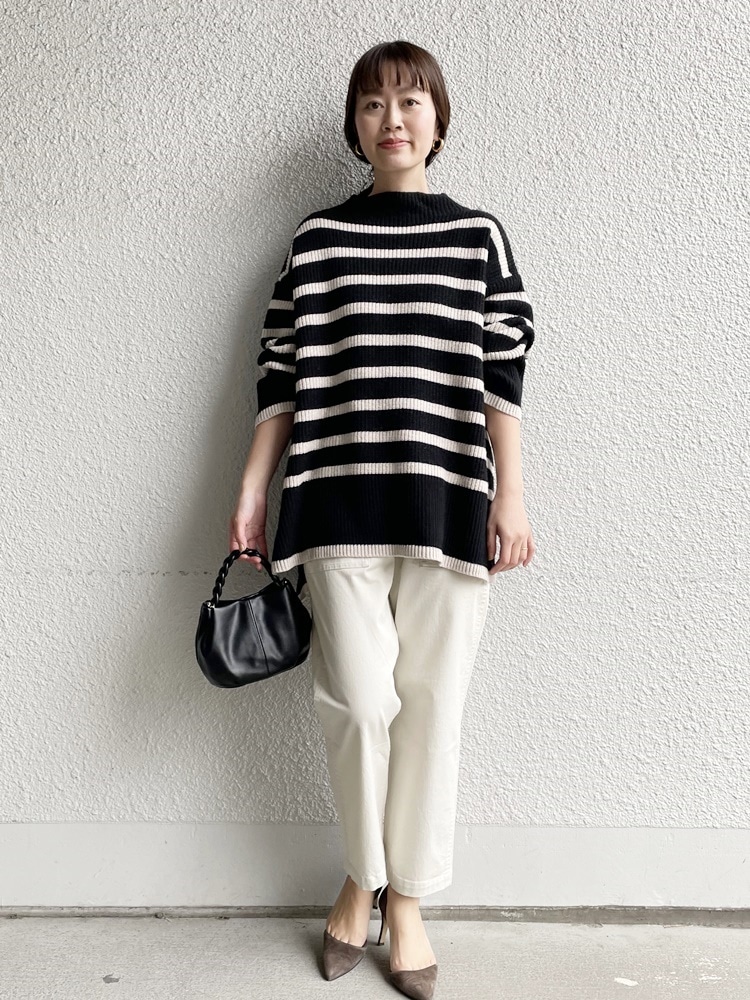 ボーダーニットに白のベイカーパンツで大人カジュアルに。