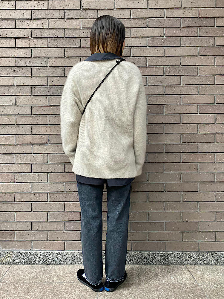 ゆったりしたサイズ感で肩の落ちたシルエット