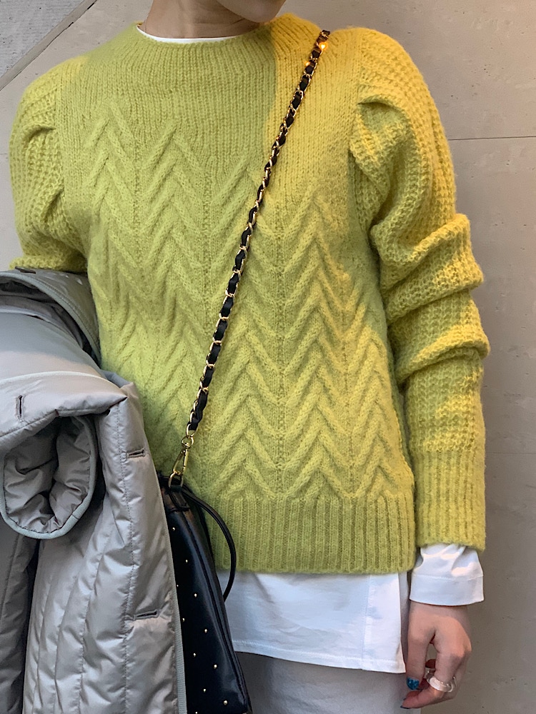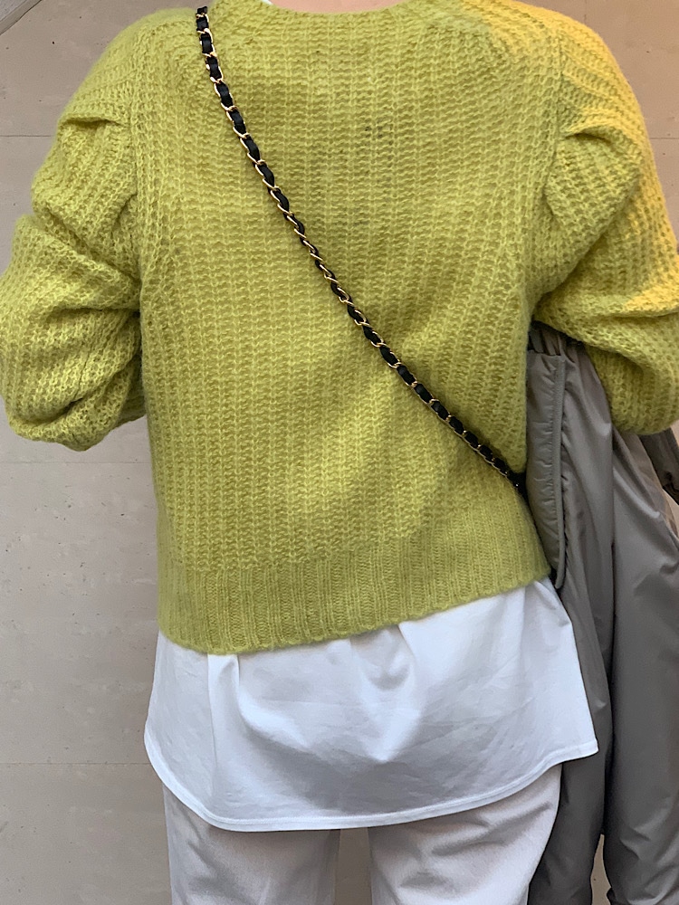 着心地:袖の編み目が大きい所がお気に入りです。カラーも華やかでアクセントになります。