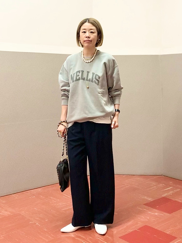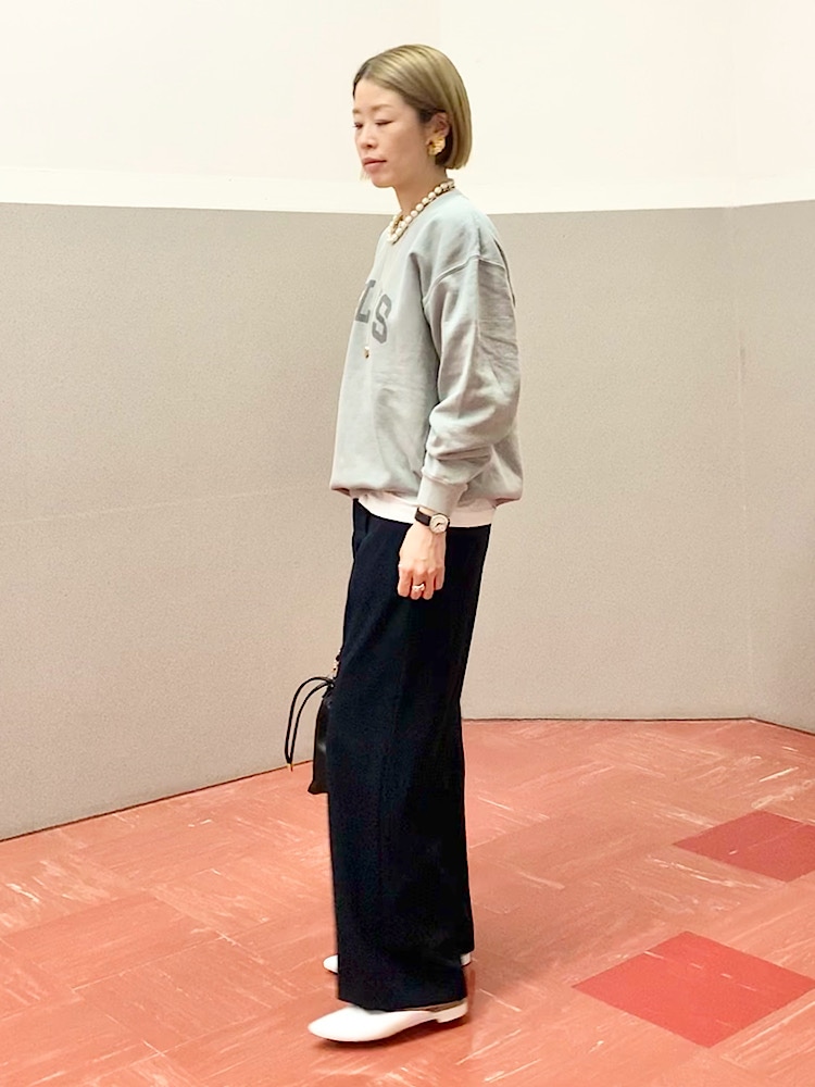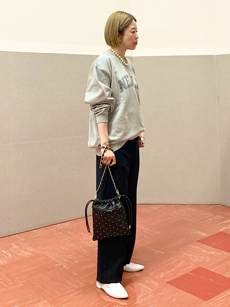 ゴールドのアクセサリーをたっぷり使うことで、グレーのスウェットでもフェミニンな印象に。