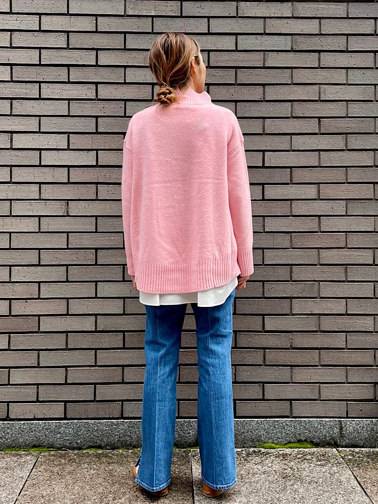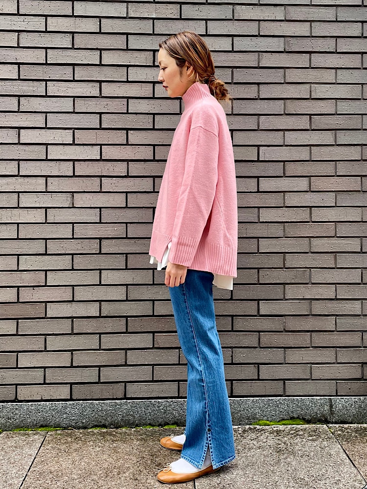 素材感・着心地:ウール/カシミヤの柔らかい素材感。サイドや首元(後ろ部分)にスリットが入っておりインナーをチラリと見せると可愛いです。ボトムを選ばない丈感です