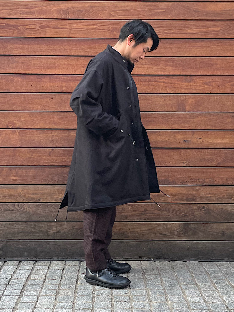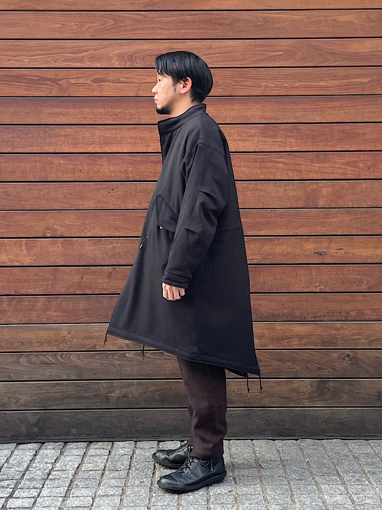 素材感/着心地:ウールの様な合繊素材。軽くて着易い。ミリタリーをベースにサイズをアレンジしたビッグシルエット。