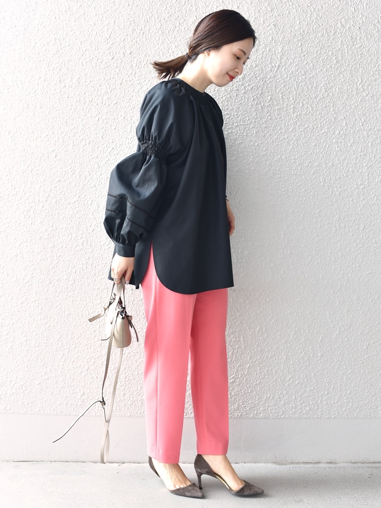 きれいめなテーパードパンツとヒールで、甘くなりすぎないコーデに。