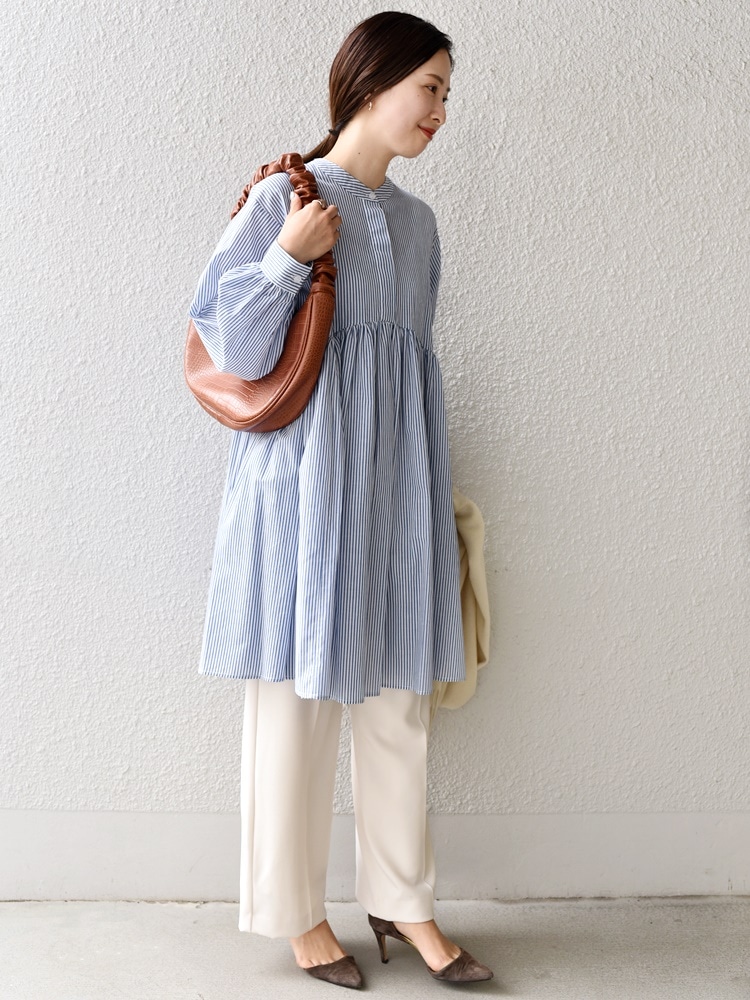 着心地:ゆとりがあるので、窮屈感がなく楽に着られます。細身のパンツと好相性ですが、切り替え位置が高めなので、ワイドパンツと合わせても重たくならずバランス良く着ていただけます。